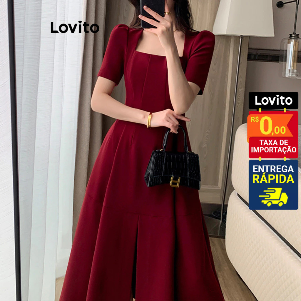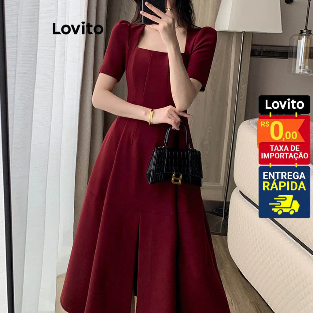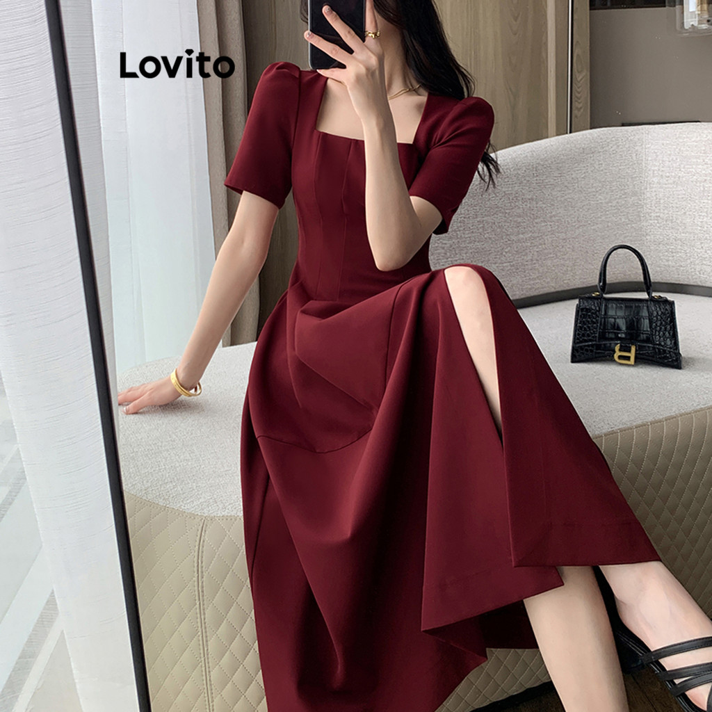 Lovito Vestido Feminino Midi Liso Decote Quadrado LNE27028