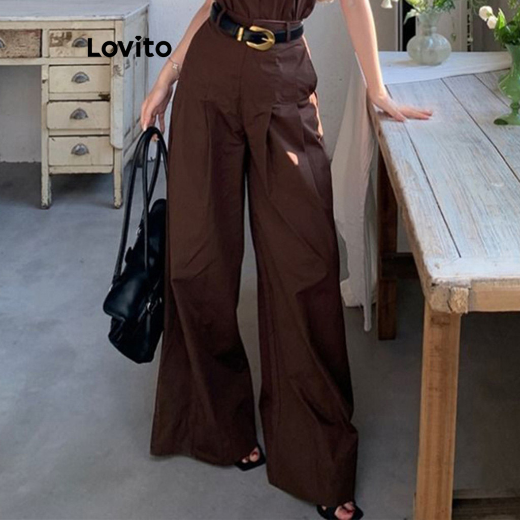 Lovito Tops ou calças femininas casuais lisas plissadas com ombros frios LNA79329