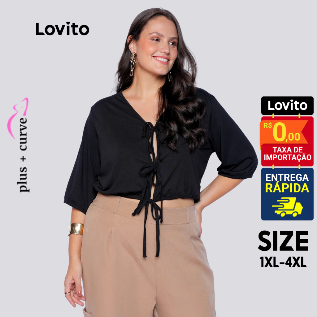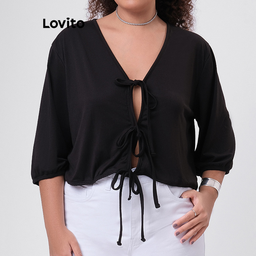 Lovito Blusa Plus Size Manga 3/4 Amarração Laços Frontais Decote V Moda Feminina LB264BRL293