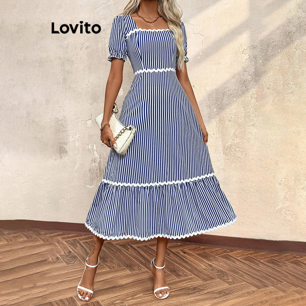 (KOL‘s pick) Lovito Boho Listrado Contraste Fita Estrutura Linha Puff Mangas Vestido para Mulheres LBL16576
