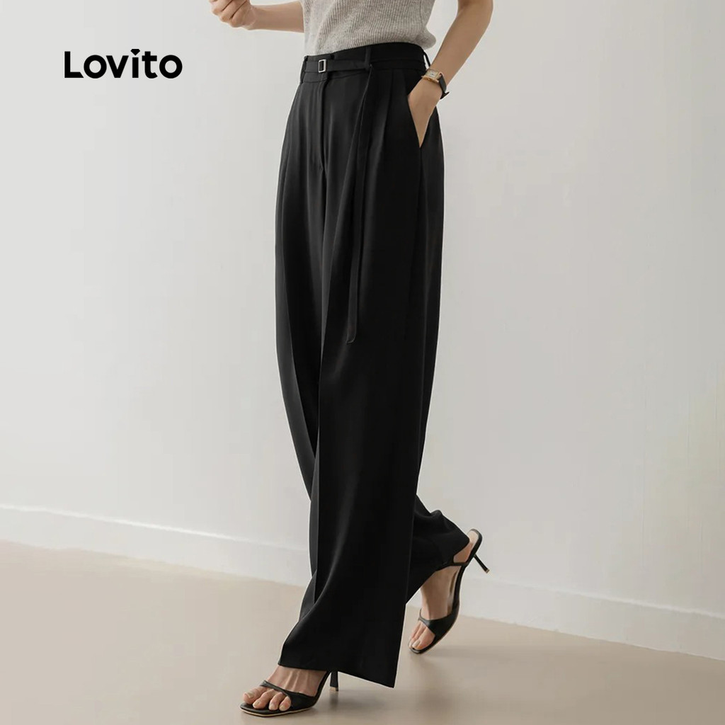 Lovito Calça Feminina Casual com Fivela Metálica e Bolso com Cinto Texturizada Primavera Verão Preta L138AD879