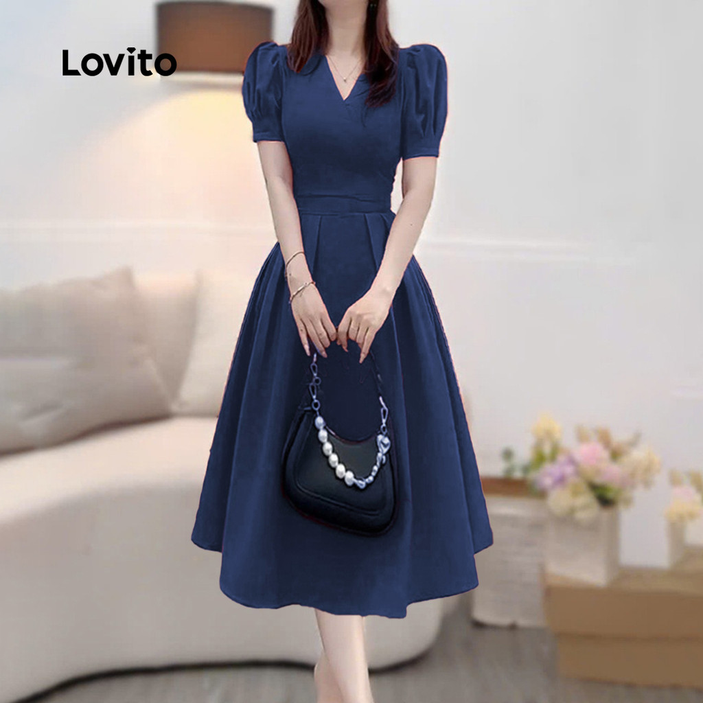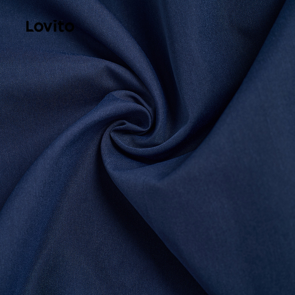 Lovito Vestido Elegante com Pregas Simples para Primavera/verão Vestido Azul-marinho para Mulheres L155ED1159