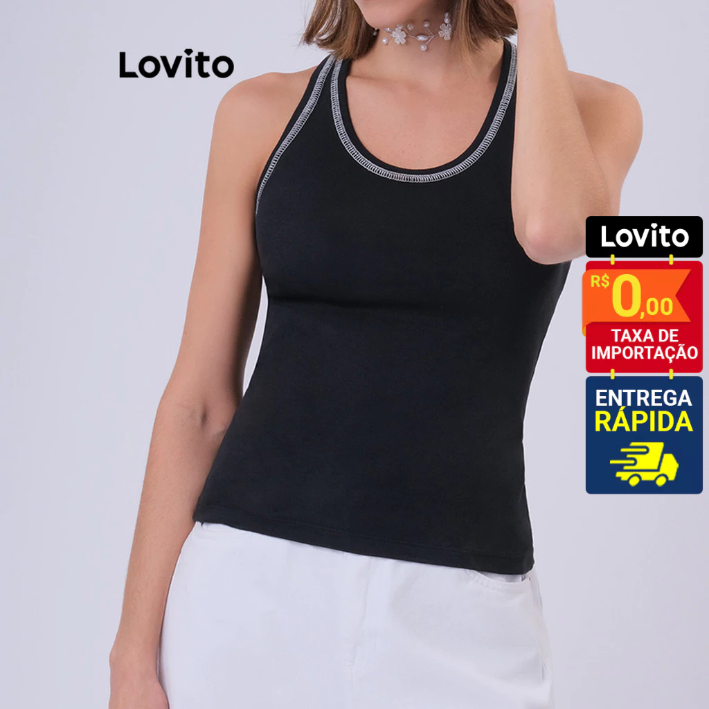 Lovito Regata Preta Casual Lisa com Costura Contrastante Feminina LB47BRL076