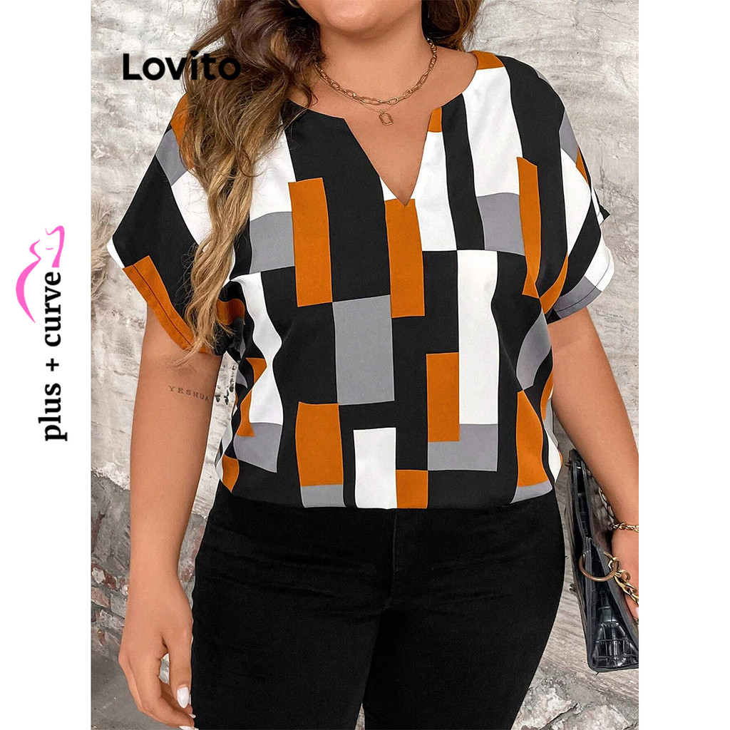 Lovito Blusa Curva Plus Size Casual Patchwork Blusa Colorblock Para Mulheres LNL81191