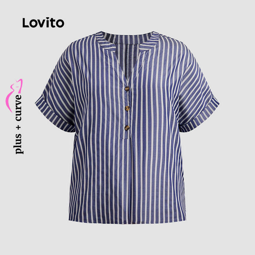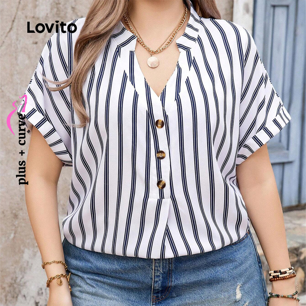 Lovito Blusa Casual Plus Size Curva Listrada Com Botões Blusa Verão/primavera Para Mulheres LBL19291