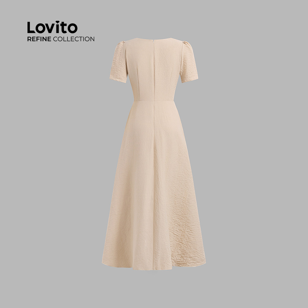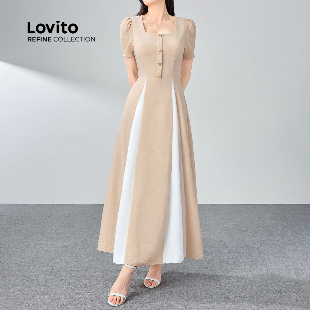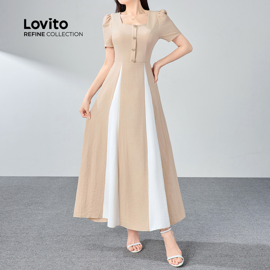 (Lovito Refine) Vestido Elegante Liso Colorblock Com Botão Primavera/Verão Cáqui Para Mulheres LR11ED016