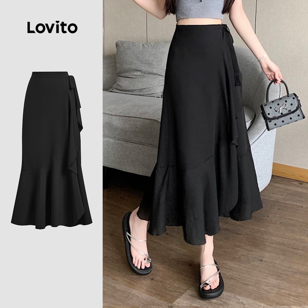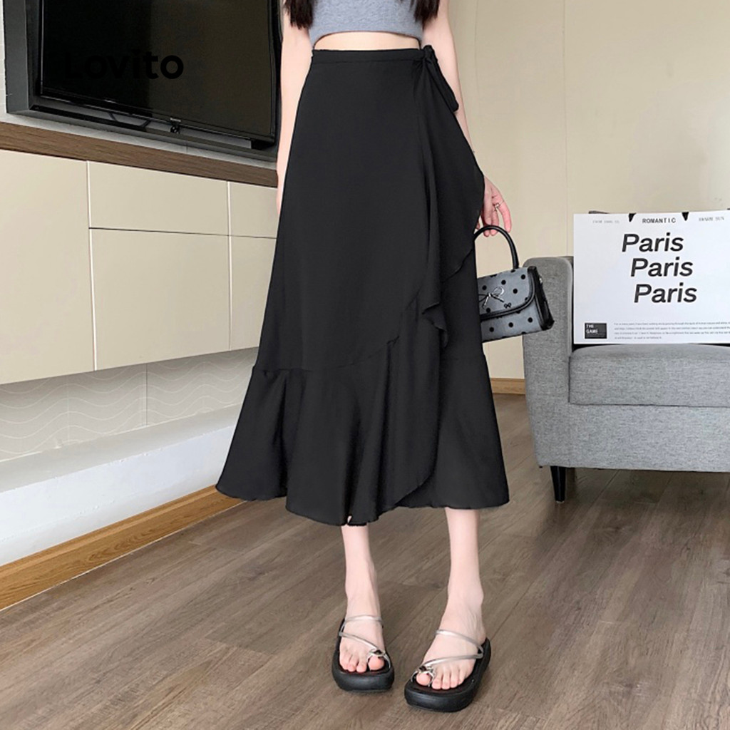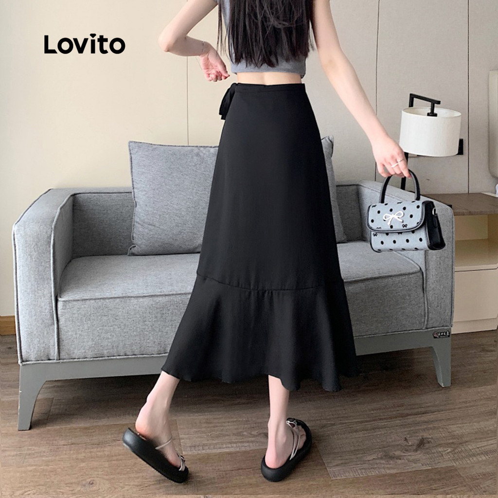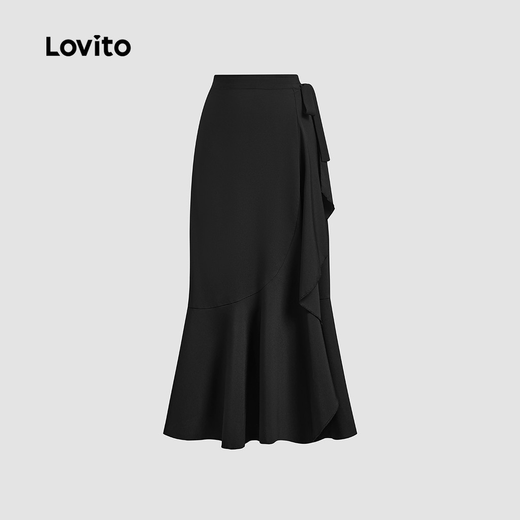 Lovito Saia Casual Feminina com Babados Frontais e Laço Liso L132ED458