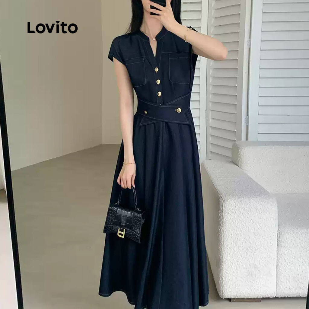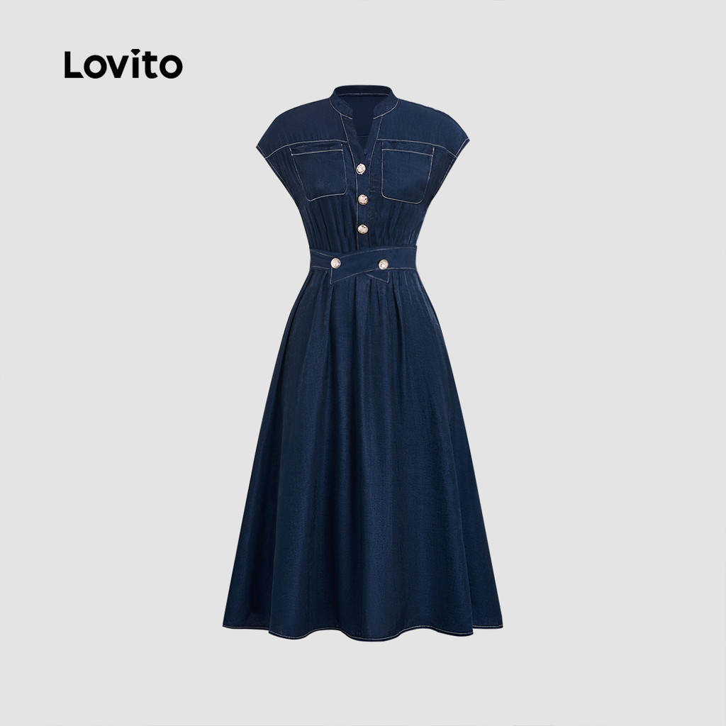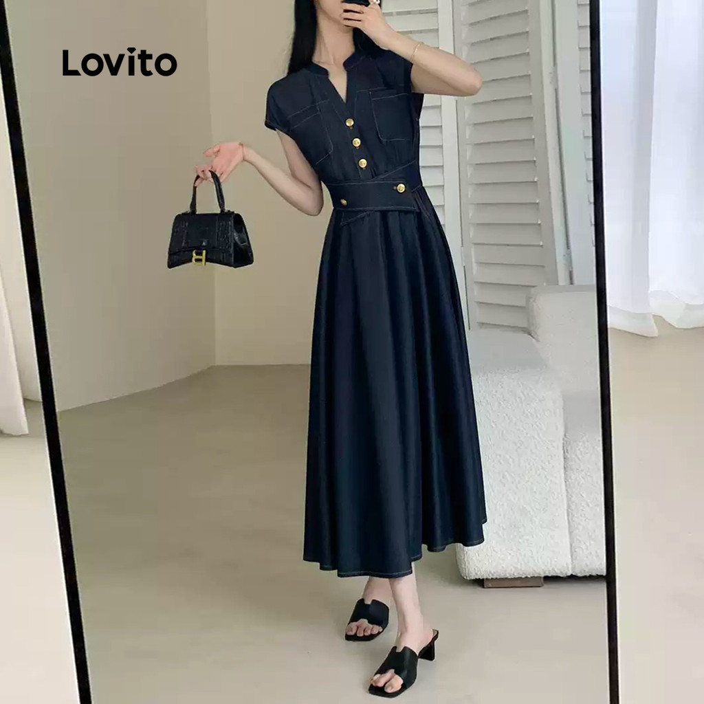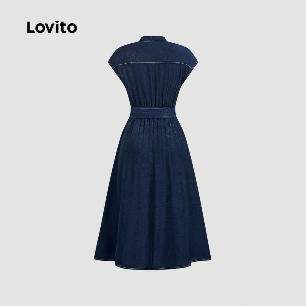 Lovito Vestido Elegante com Cinto Botões Primavera/verão Vestido Azul Escuro para Mulheres L143AD730