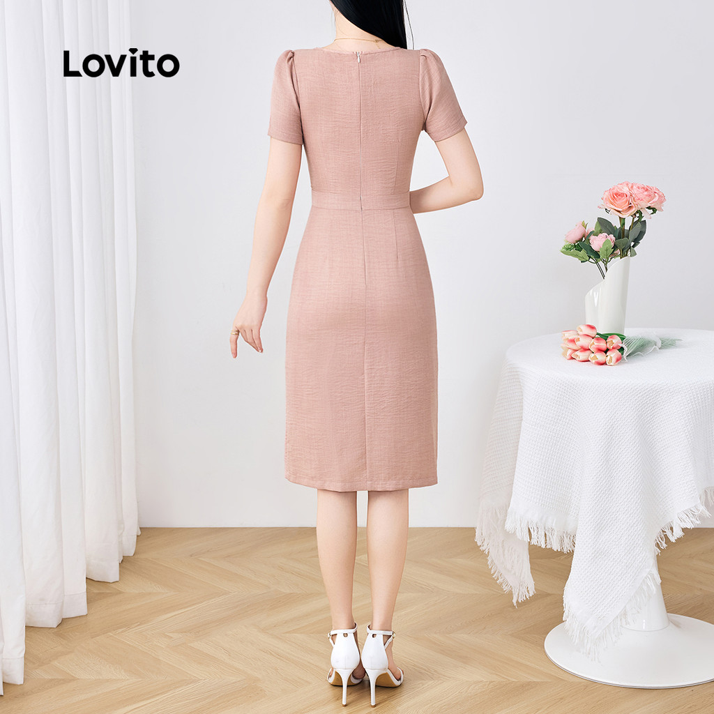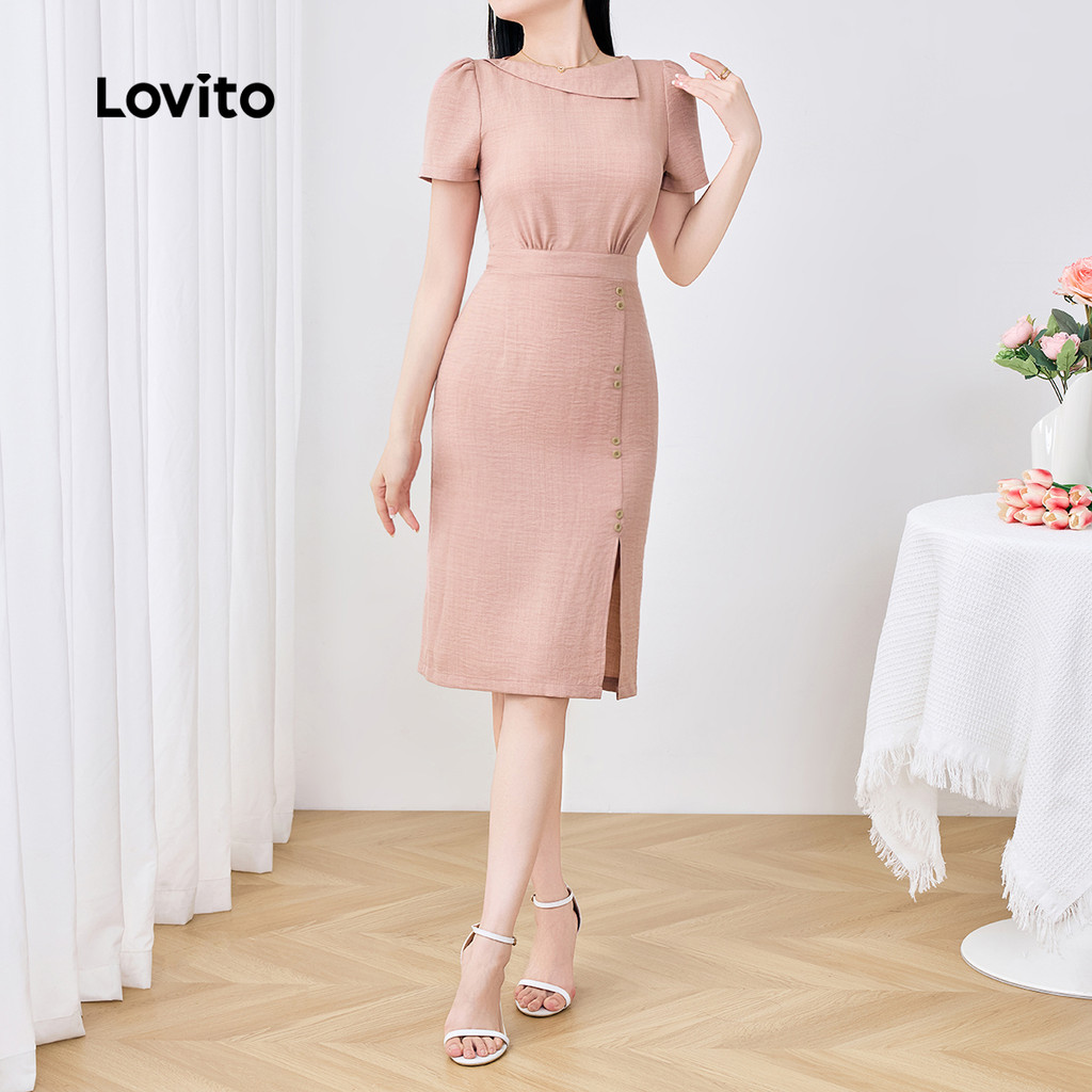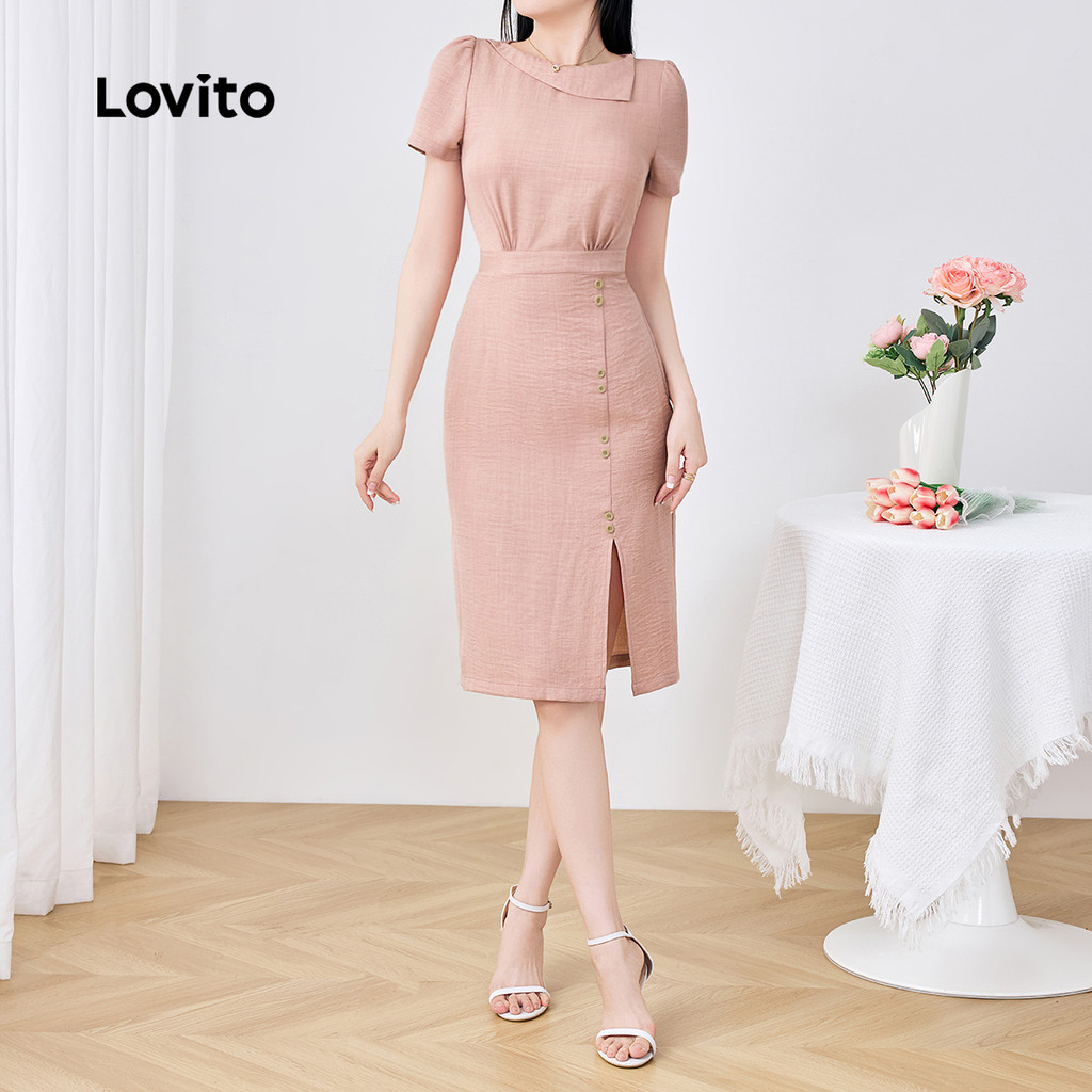 (New) Lovito Vestido Elegante Assimétrico com Botões Primavera/verão Vestido Rosa para Mulheres L142LD565