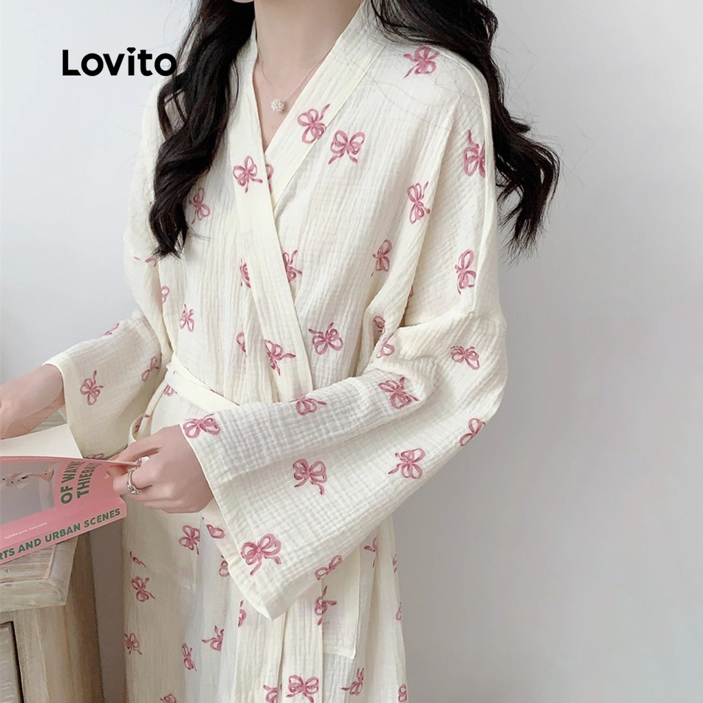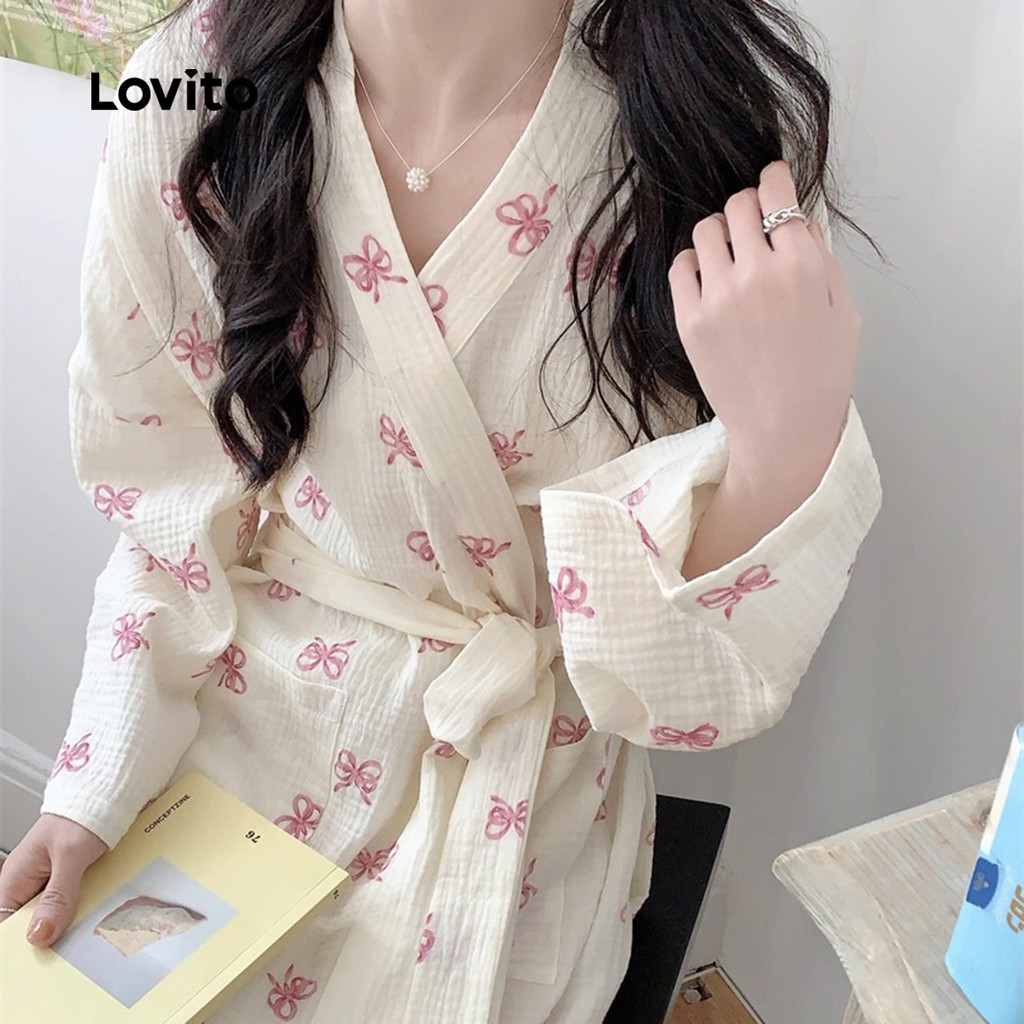 Lovito Moda Coreana Casual Robe Feminino Com Estampa De Borboleta E Laço Floral Estilo Damasco LNE1132X061