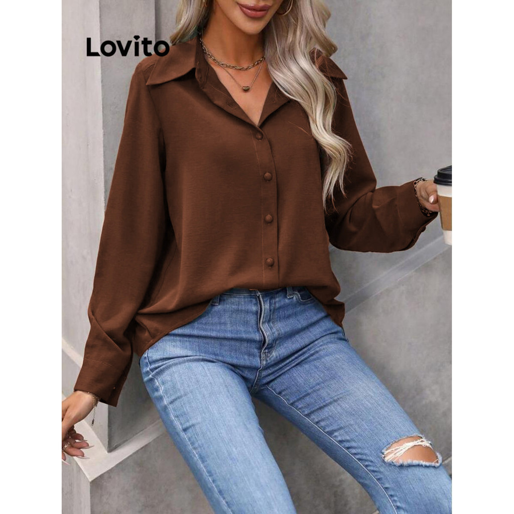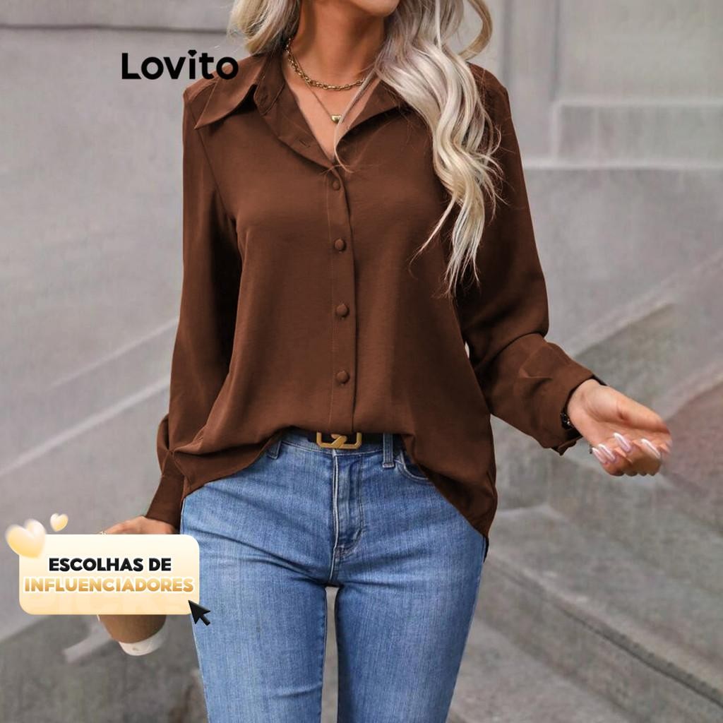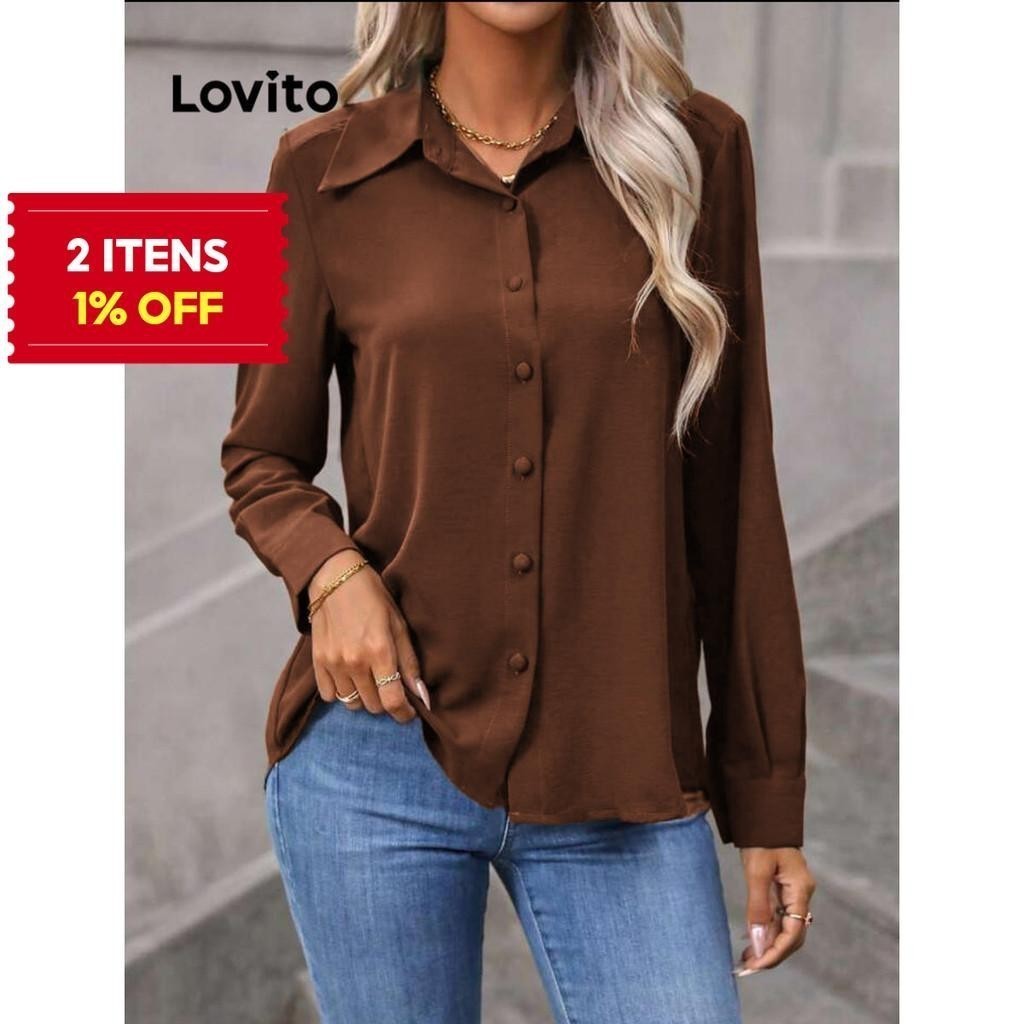(KOL‘s pick) Lovito Blusa Casual Blusa Frontal Com Botão Liso Para Mulheres LNL298