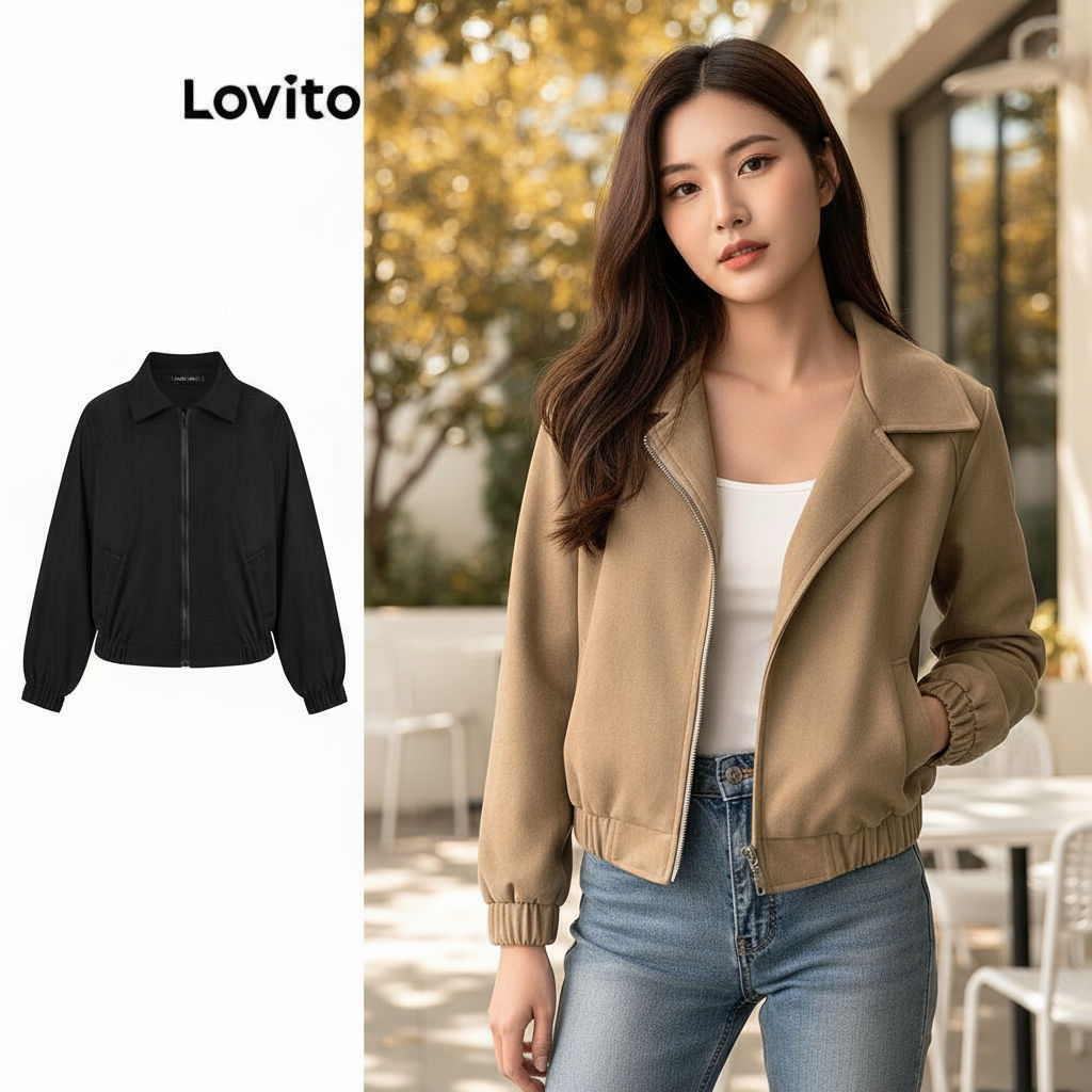 Lovito Jaqueta Feminina Casual com Zíper Liso Cor Marrom LNE30129