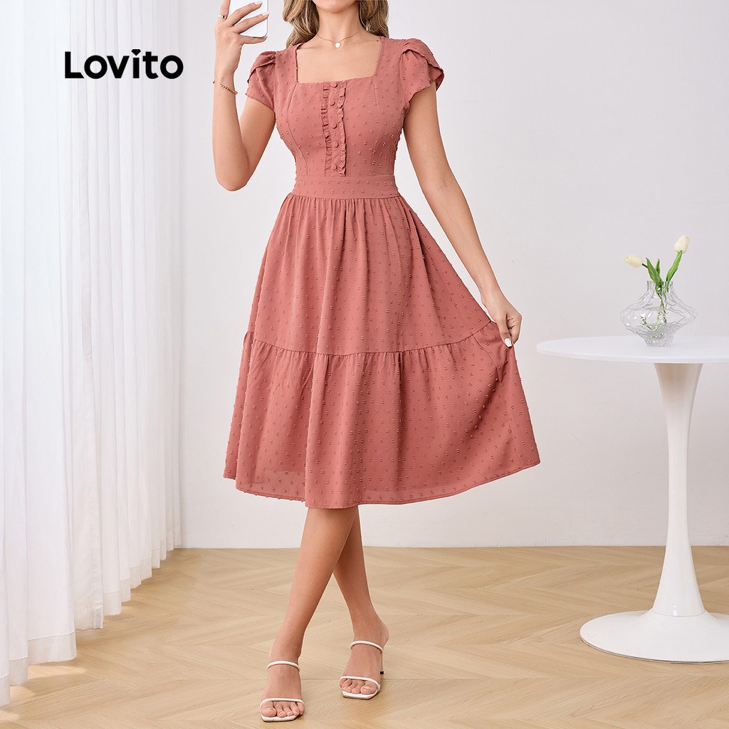 Lovito Elegante Vestido Jacquard Liso Com Babados Primavera/Verão Rosa Para Mulheres LBL25063