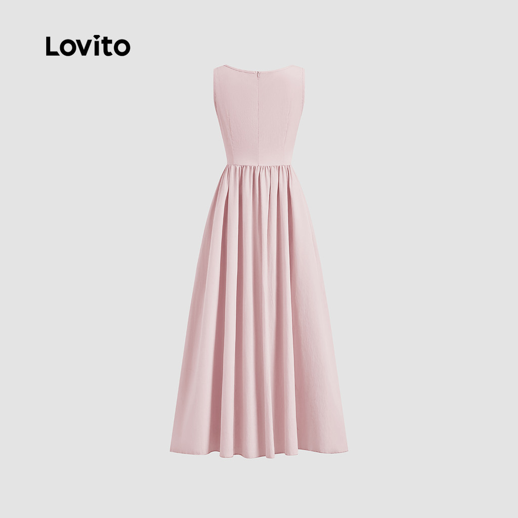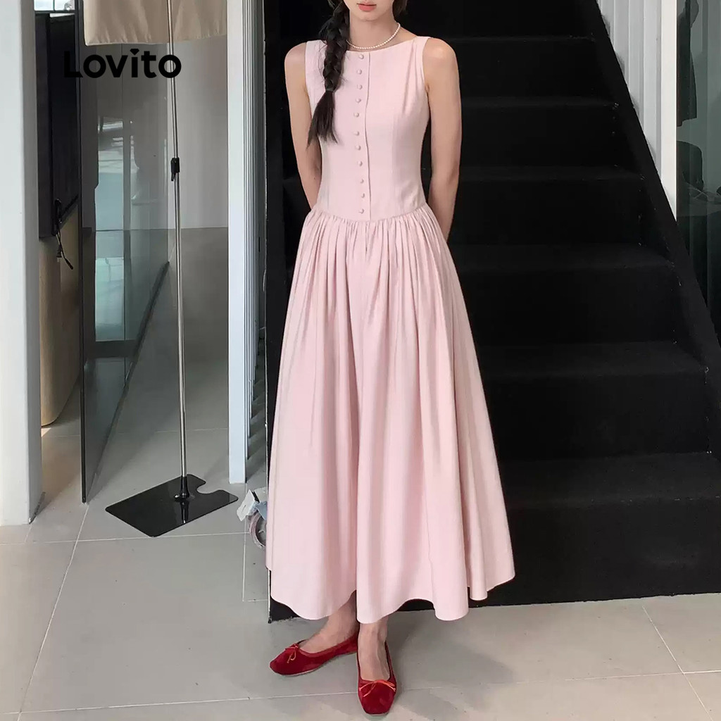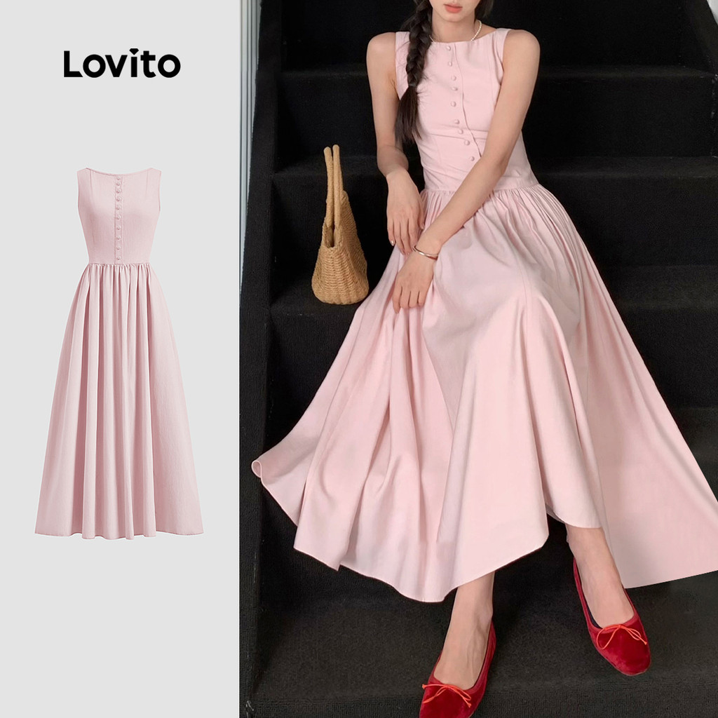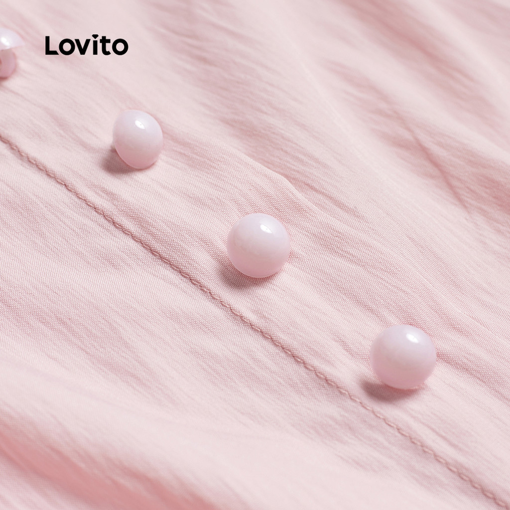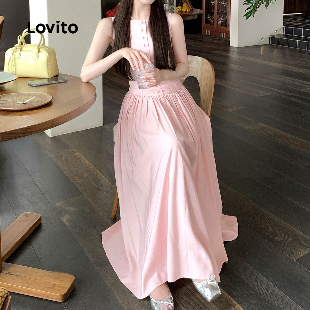 (Trendy) Lovito Vestido Casual Liso Primavera E Verão Vestido Drapeado Com Botões Para Mulheres L125AD198