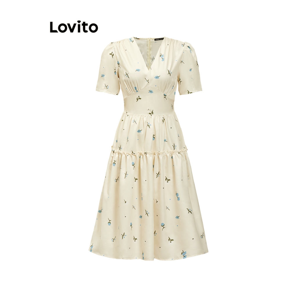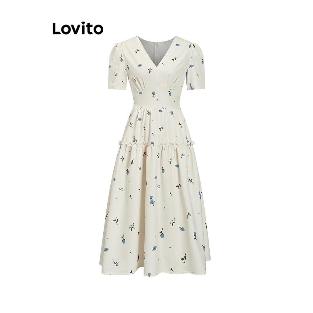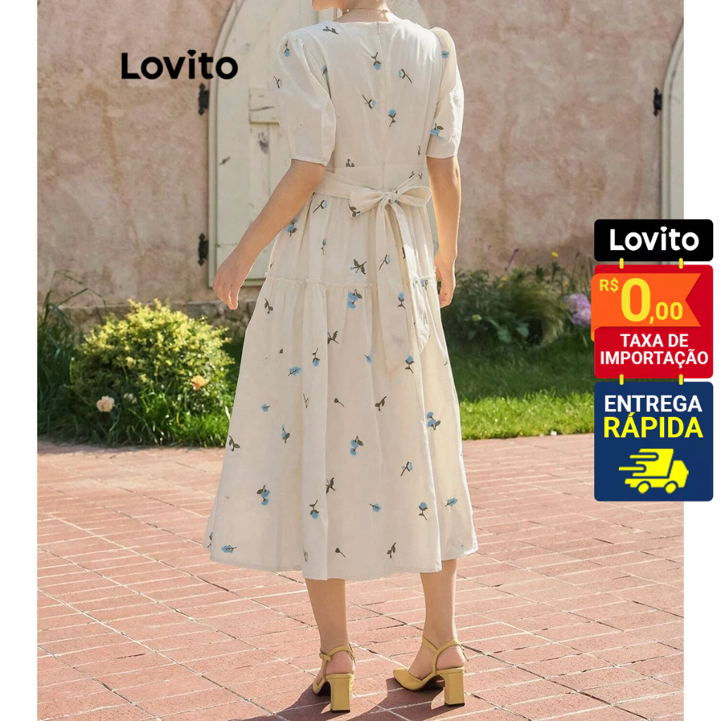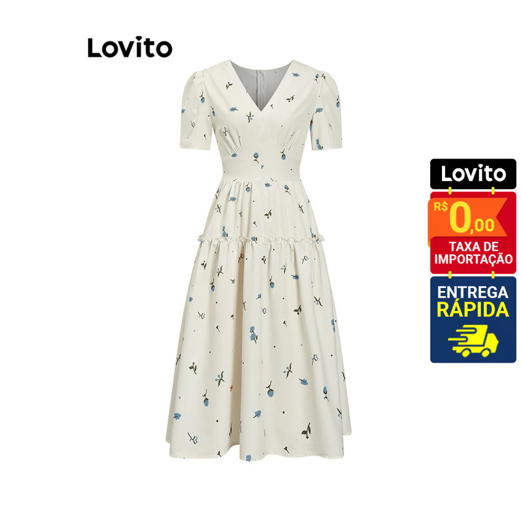 Lovito Vestido Feminino Midi Camponesa com Mangas Bufantes Floral L71ED267
