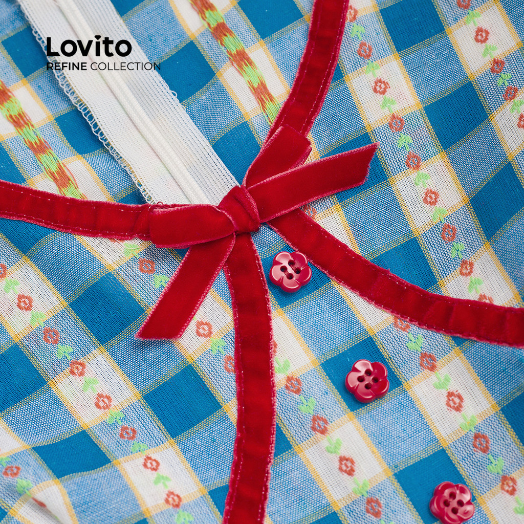 (Lovito Refine) Vestido Azul de Primavera/verão com Laço Casual com Babados e Gola drapeada LR12A407