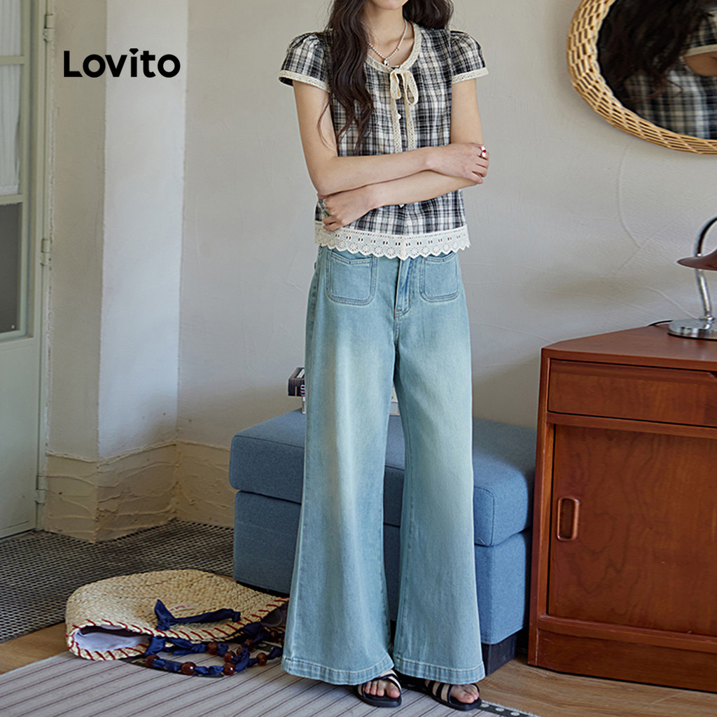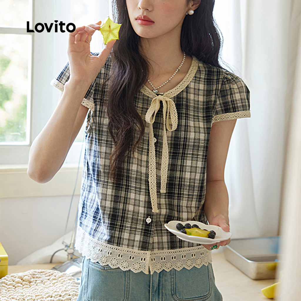 Lovito Blusa Casual Com Botões E Babados Gola Alta Primavera/verão Blusa Preta E Branca Para Mulheres L144AD014