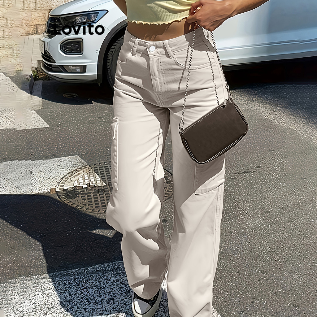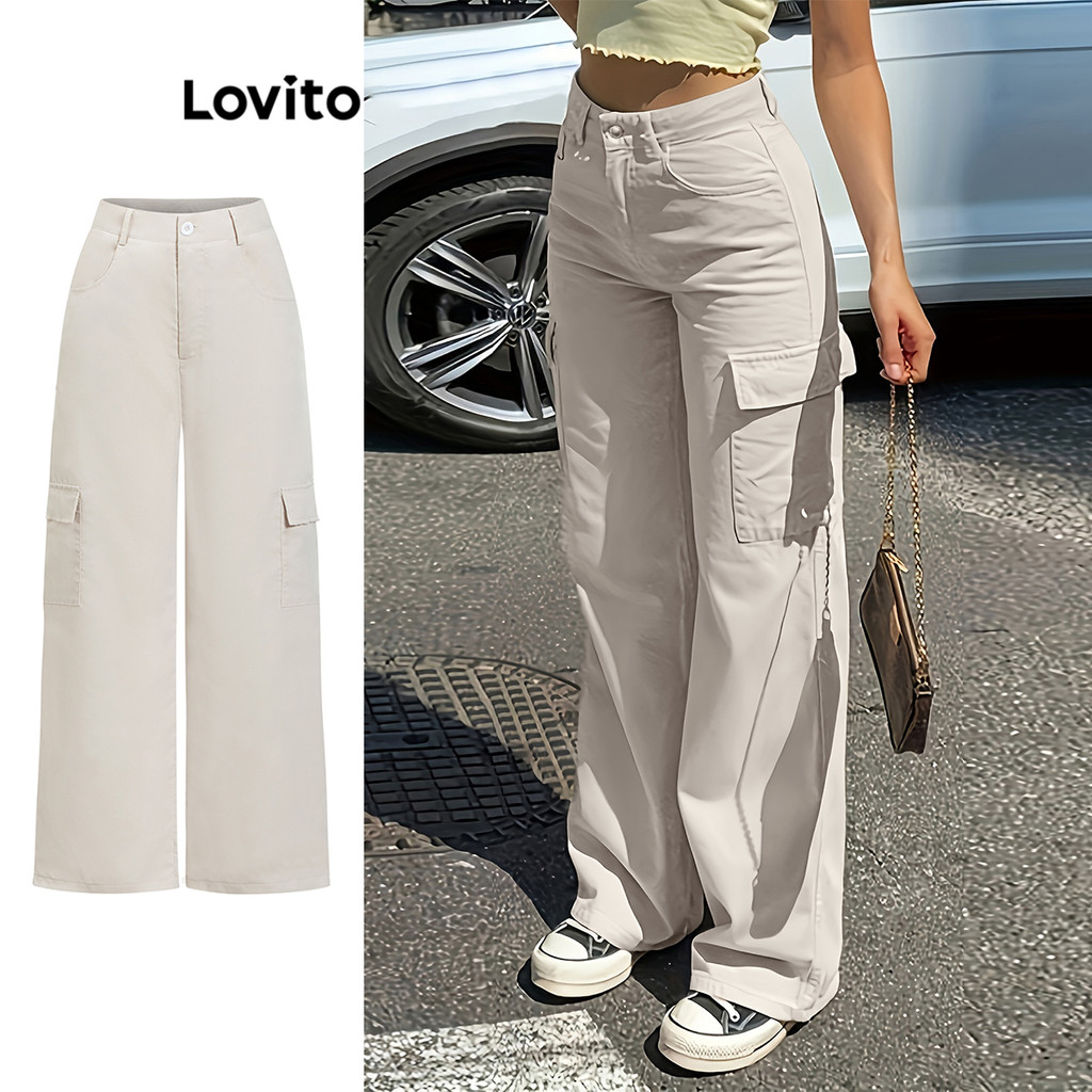 trendy5-Lovito Calça Casual Com Bolso Liso E Zíper Para Mulheres L104ED018