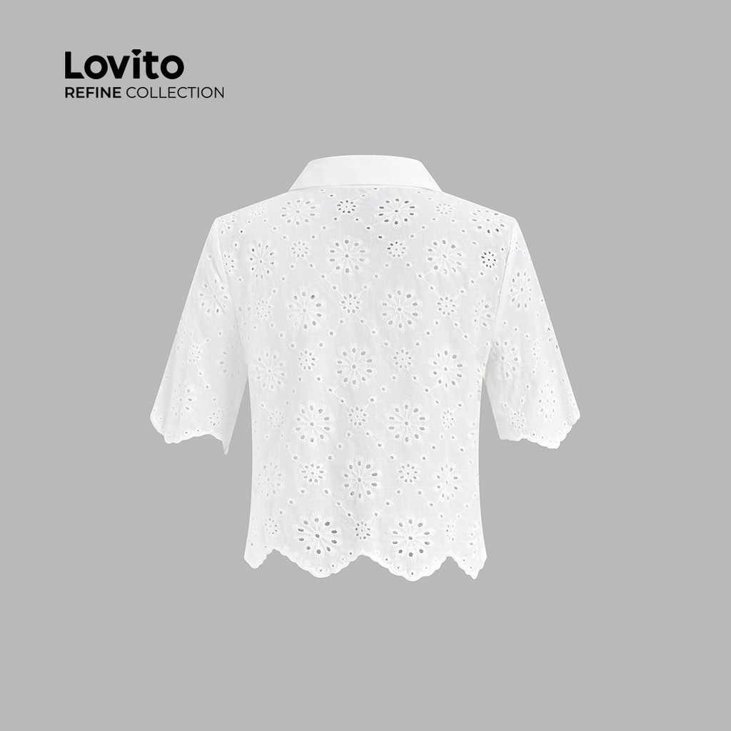 (Lovito Refine) Blusa Elegante Bordado com Ilhós Bolso Falso Botão Primavera/verão Blusa Branca LR21L096