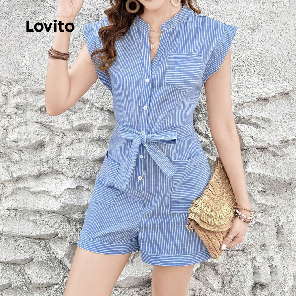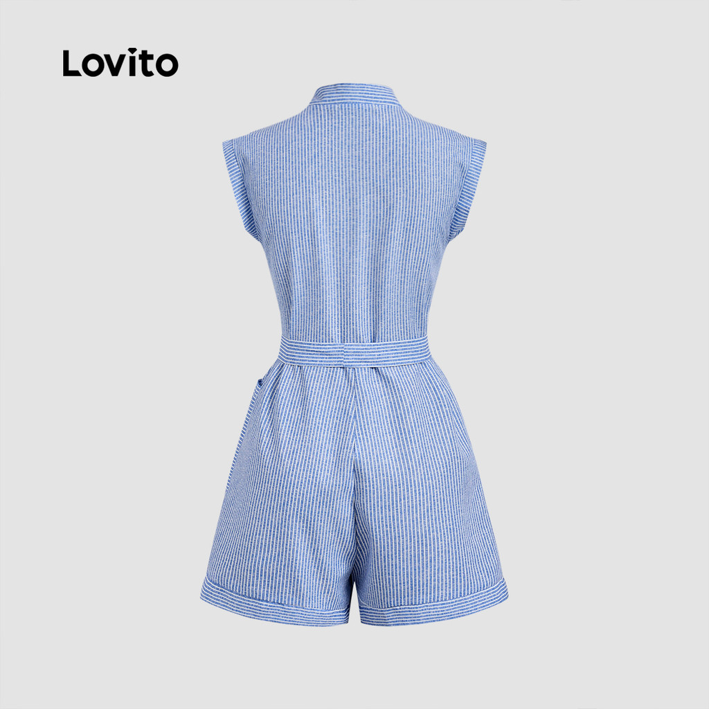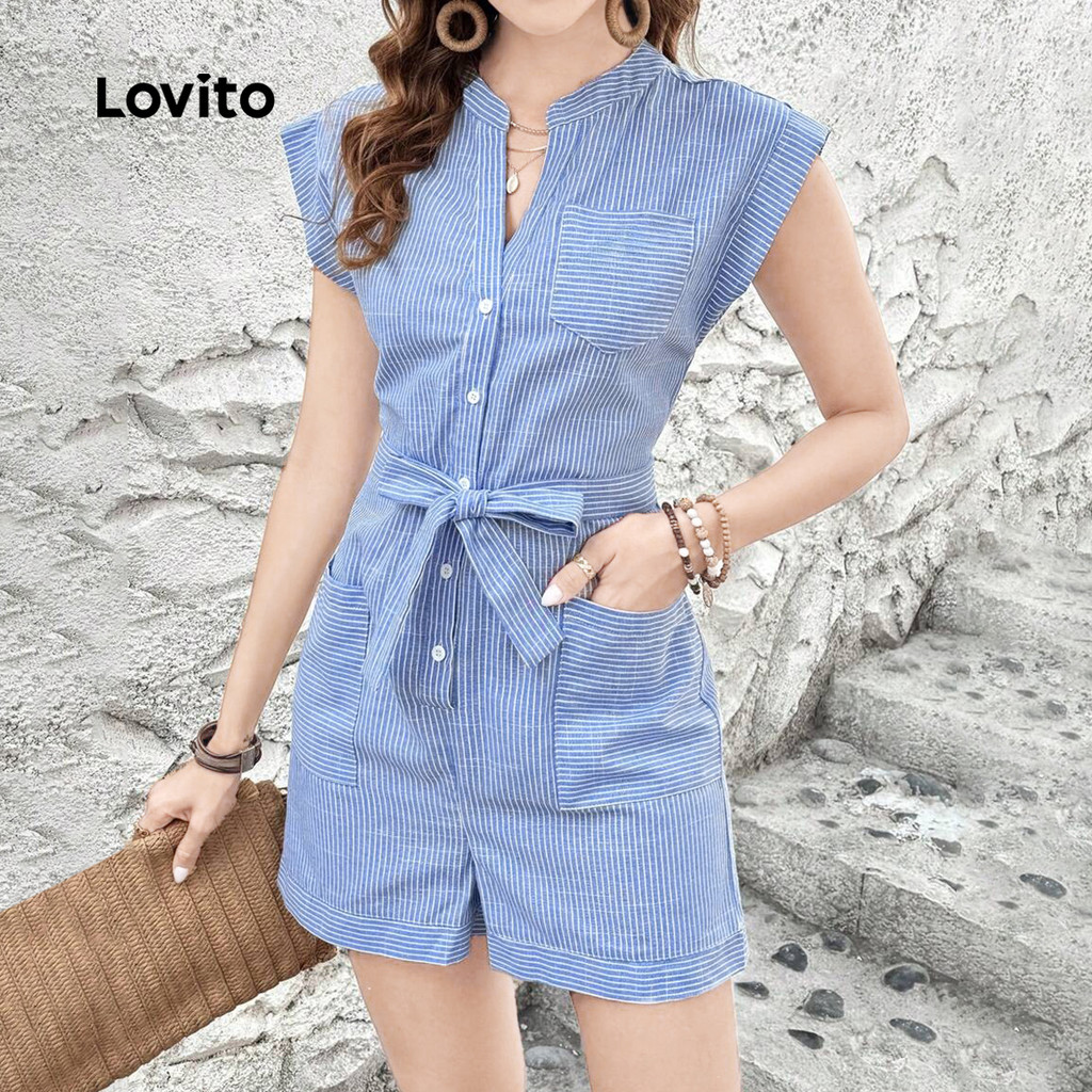 (New) Lovito Macacão Casual com Cadarço Laço Bolso Primavera/verão Azul para mulheres L243AD658