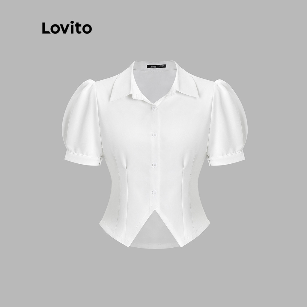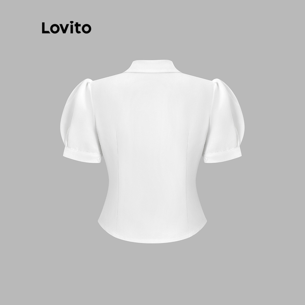 (Trendy) Lovito Blusa Casual Com Botão Liso Y2K Blusa Manga Bufante Para Mulheres L52AD035 (Branco)