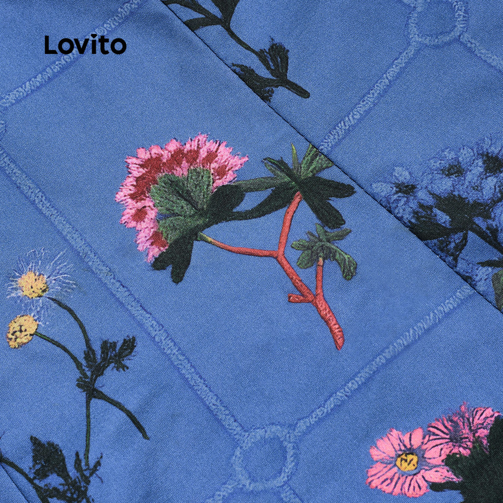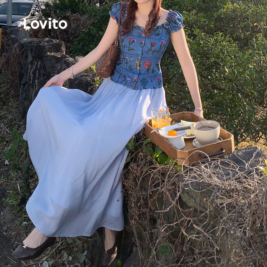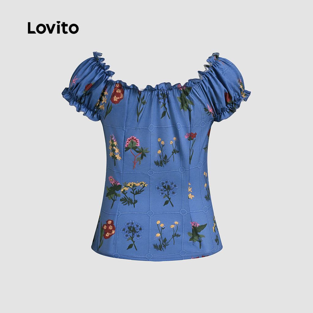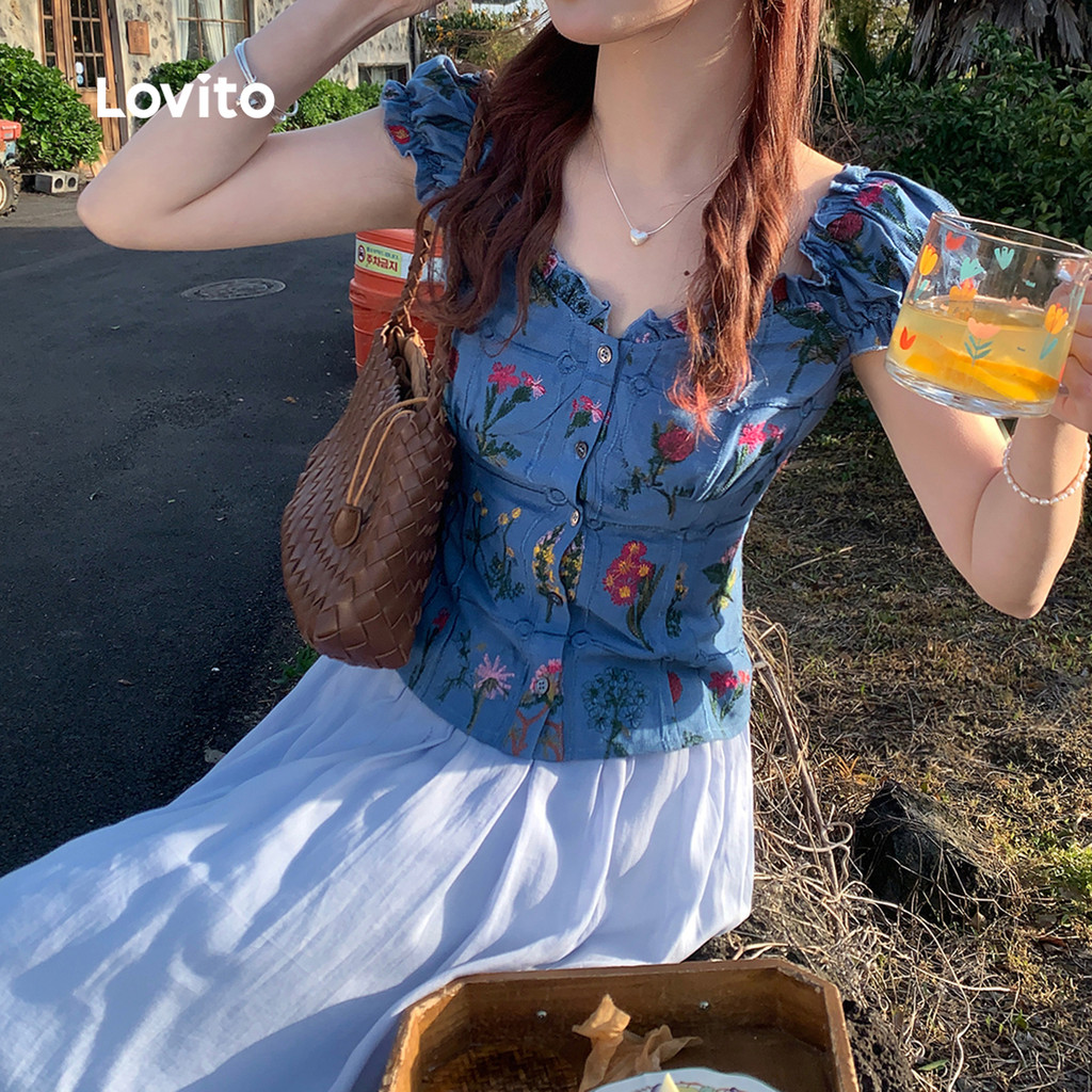 (New) Lovito Blusa Fofa com Flores Babado No Gola Primavera/verão para Mulheres L151AD407