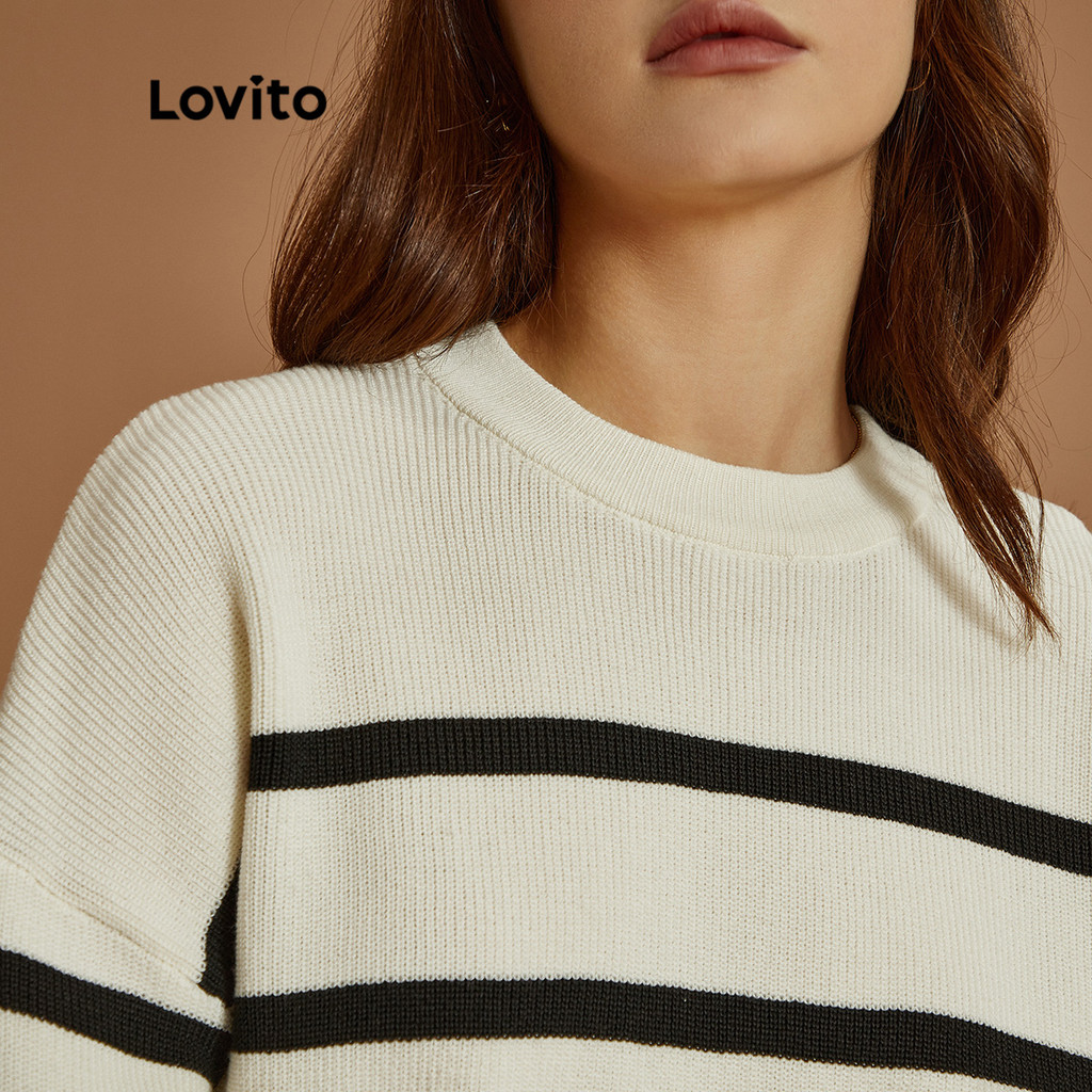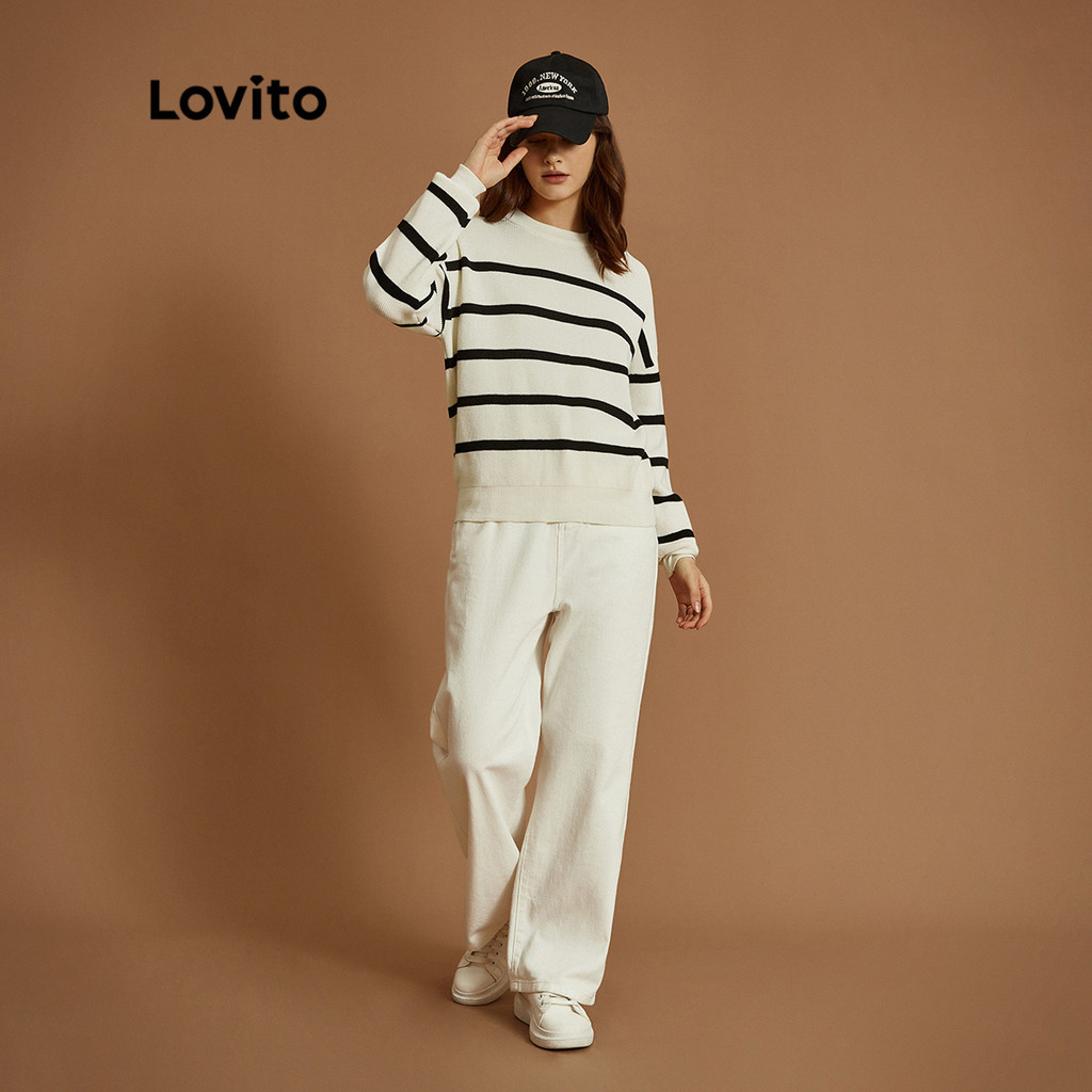 Lovito Suéter Casual Listrado Macio de Alta Elasticidade Manga Longa para Mulheres L32ud004 (Branco-Sujo)