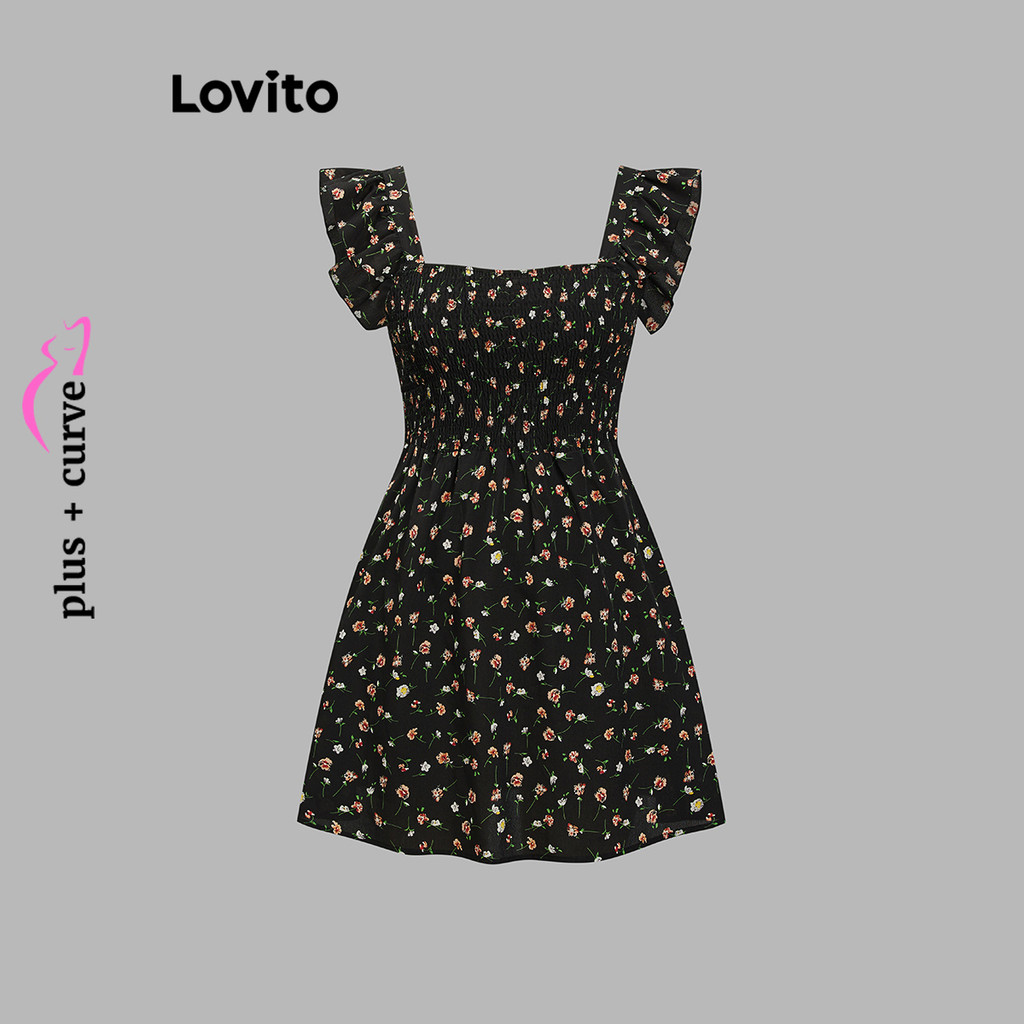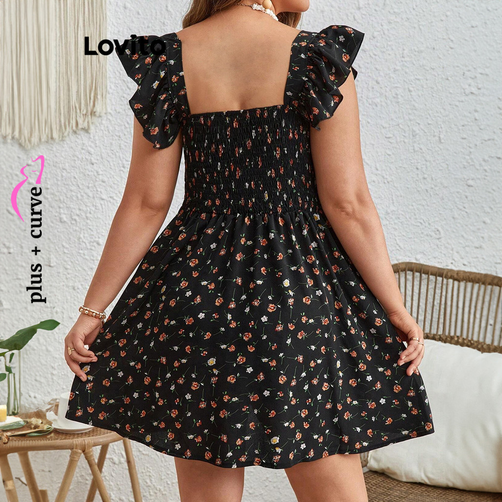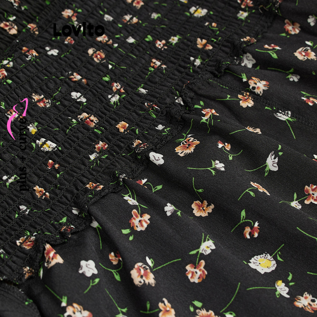 Lovito Refine Vestido Plus Size Curvas Elegante Floral Delicado Estampado Smocked Feminino LBL18614
