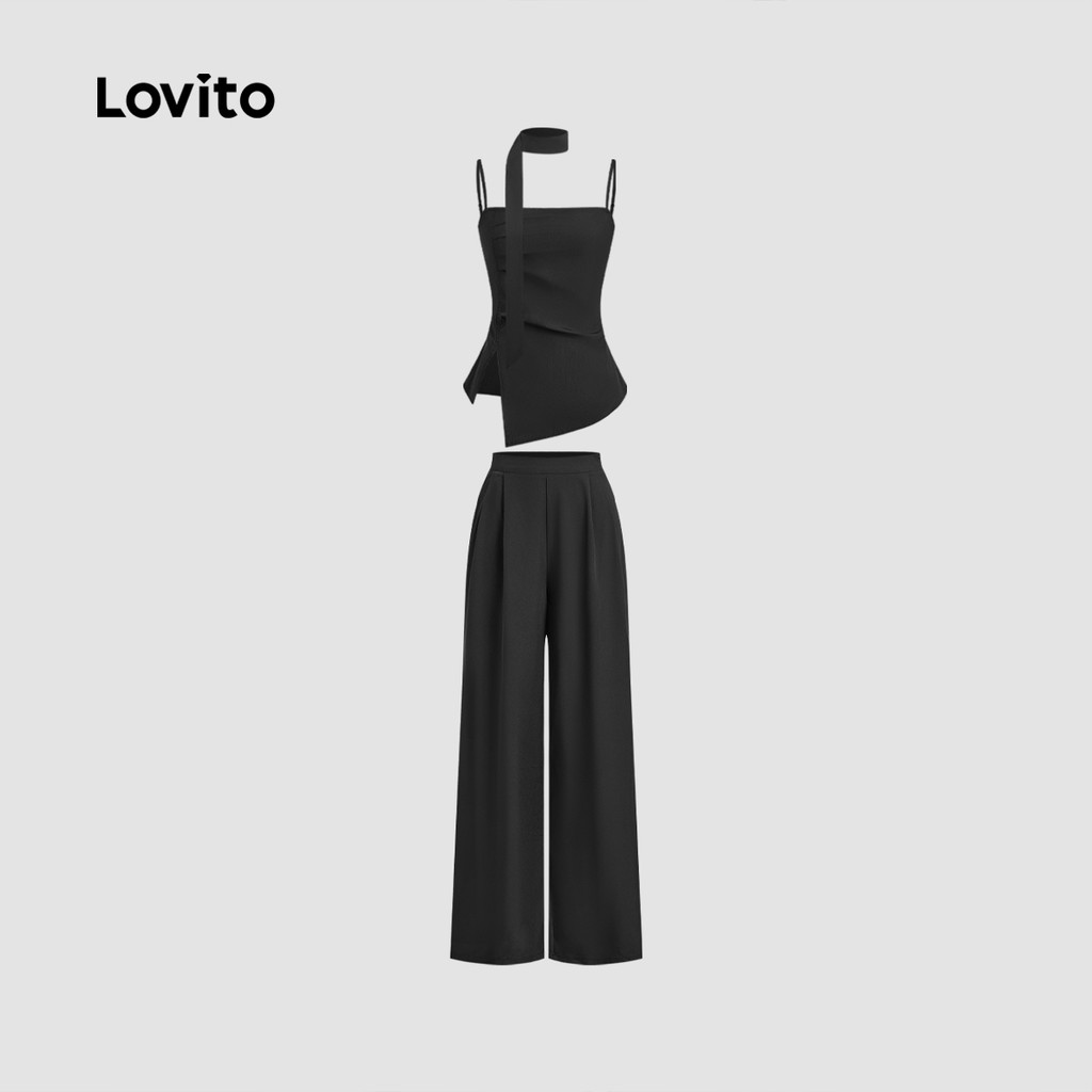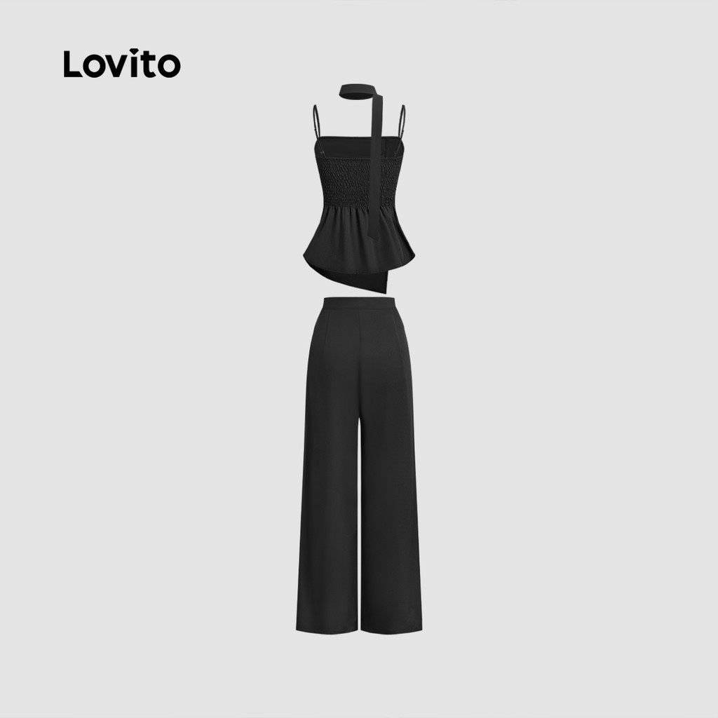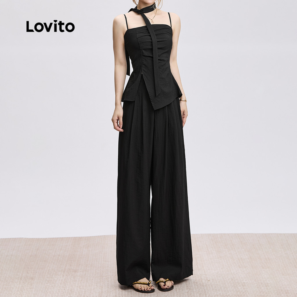 Lovito Conjuntos de Calças Elegantes com Fita Primavera/verão Calças Pretas para mulheres L142LD229