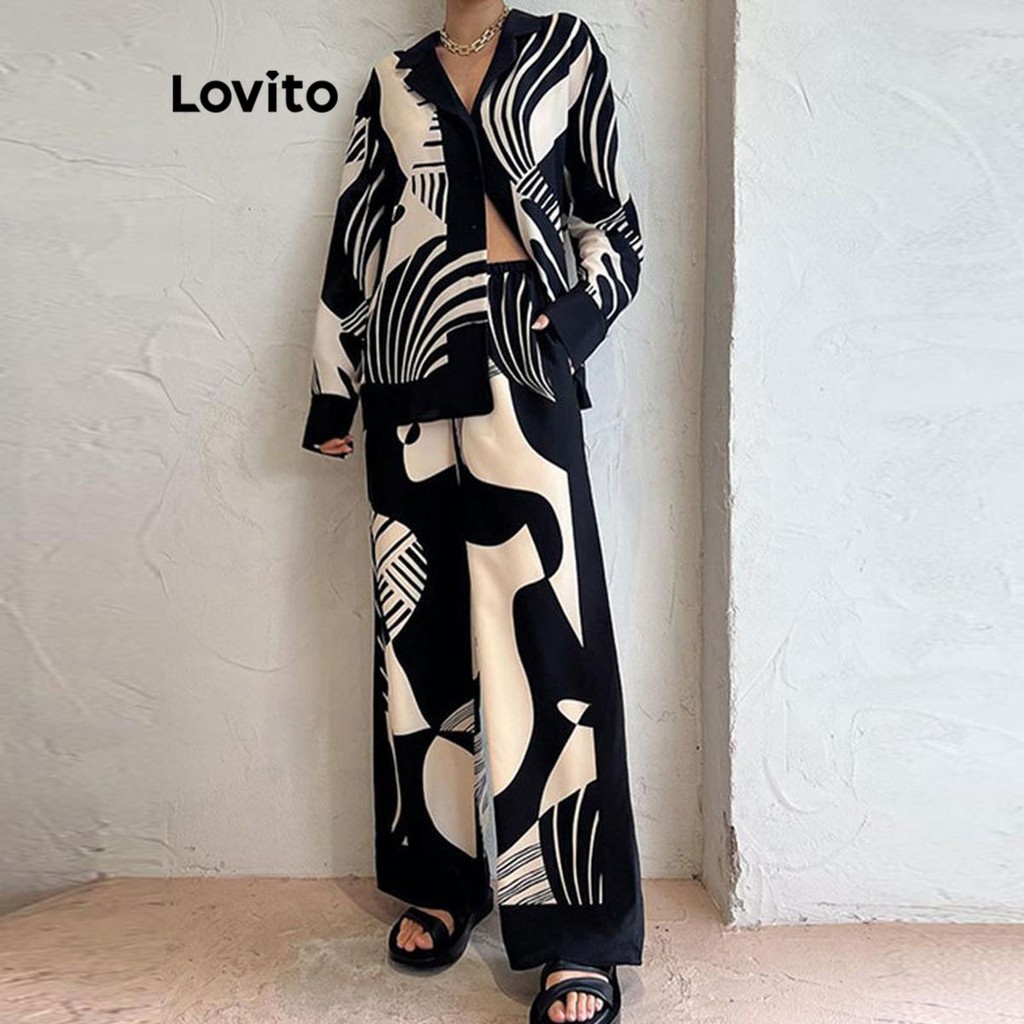 (Trendy) Lovito Conjuntos De Calças Casuais Conjuntos De Calças Com Botões Geométricos Para Mulheres LNL61330