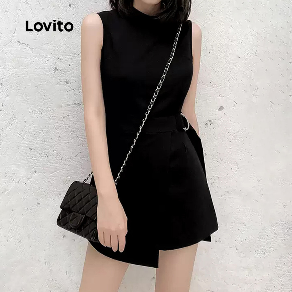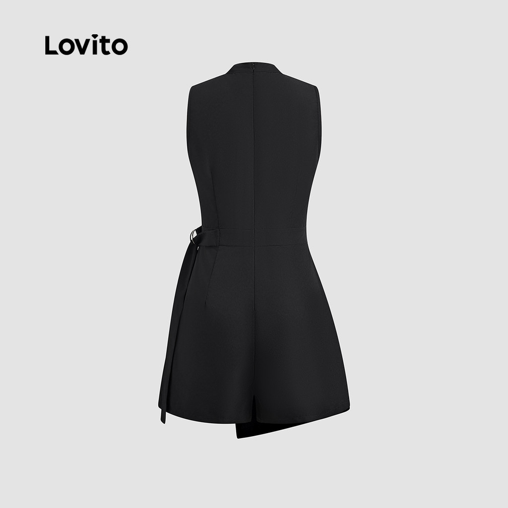 Lovito Macacão Feminino Casual Liso com Fivela de Metal Assimétrica em Preto para Primavera/Verão L135A2D274