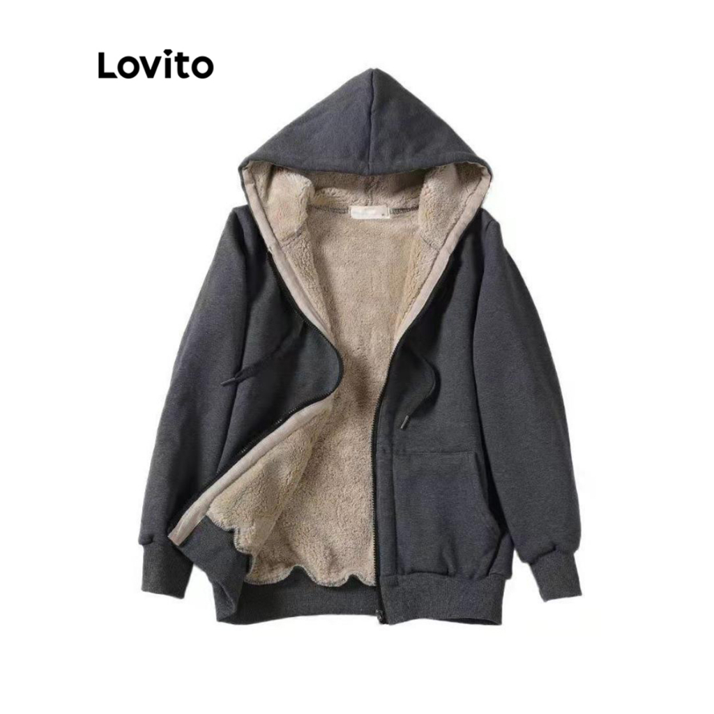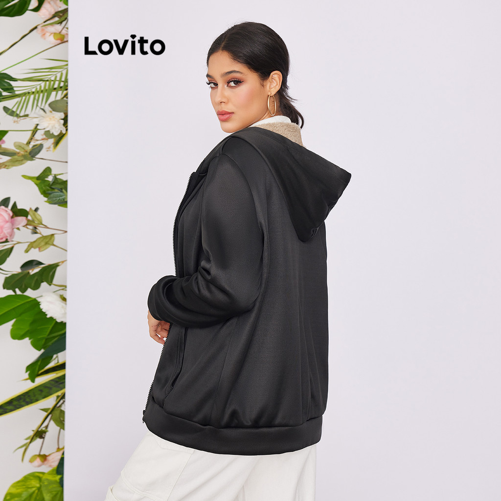 Jaqueta Feminina Casual Solta com Zíper e Forro de Pele, Mangas Longas, Cor Preta - Lovito LNA06174