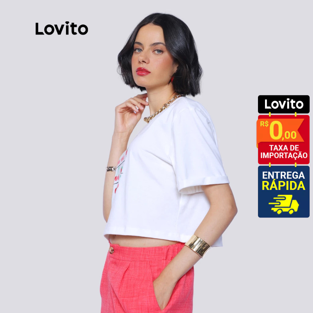 Lovito x Glenda T-Shirt Cropped Manga Curta Moda Estampa Divertida Morangos LB1386BRL1416