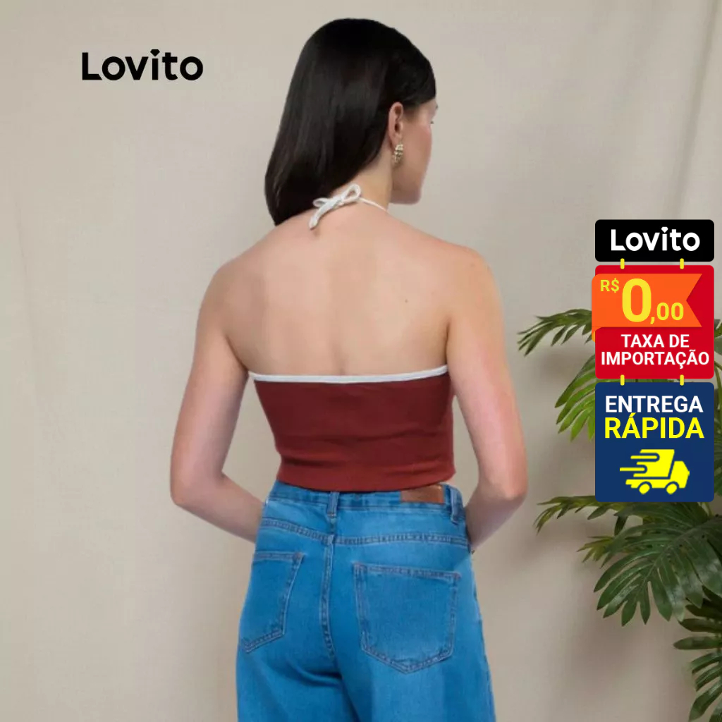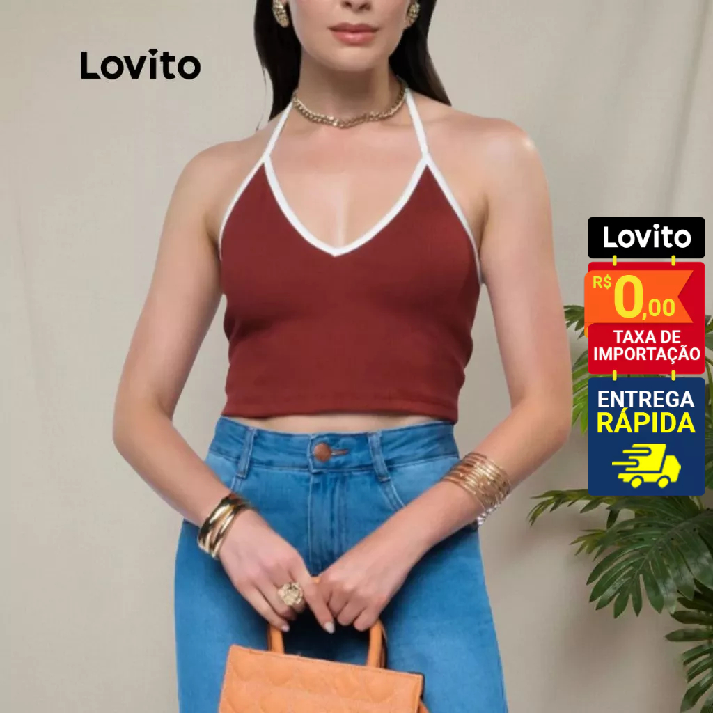 Lovito Top Decote V Basico Marrom Moda Feminina Com Amarração de Malha LB969BRL999