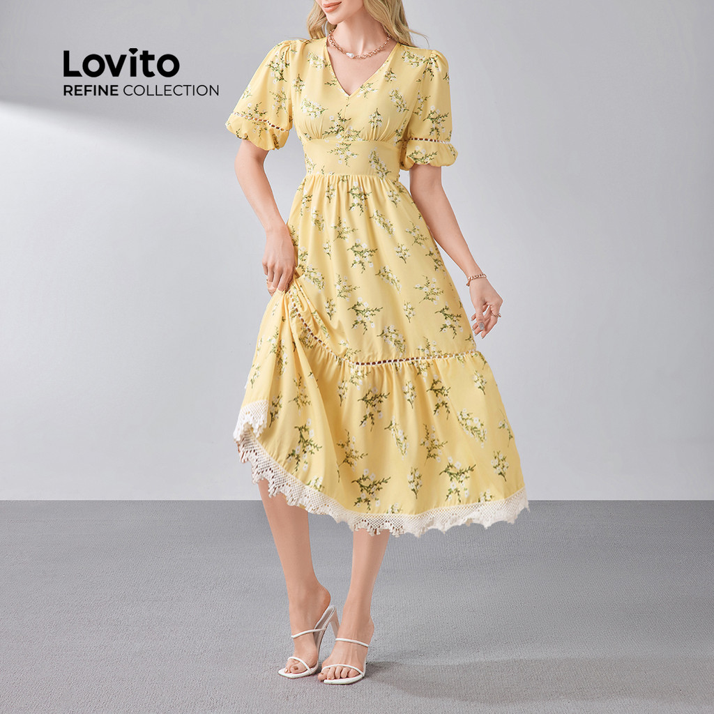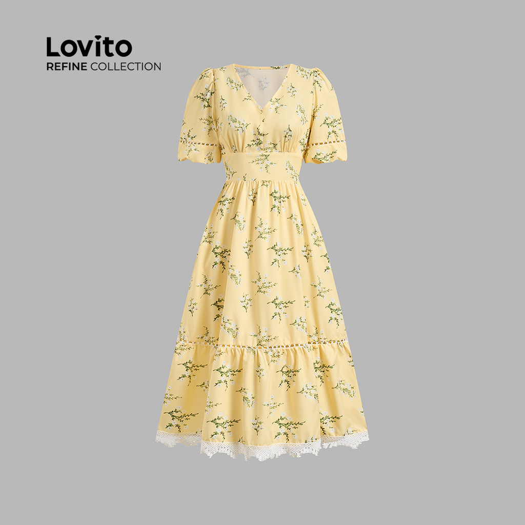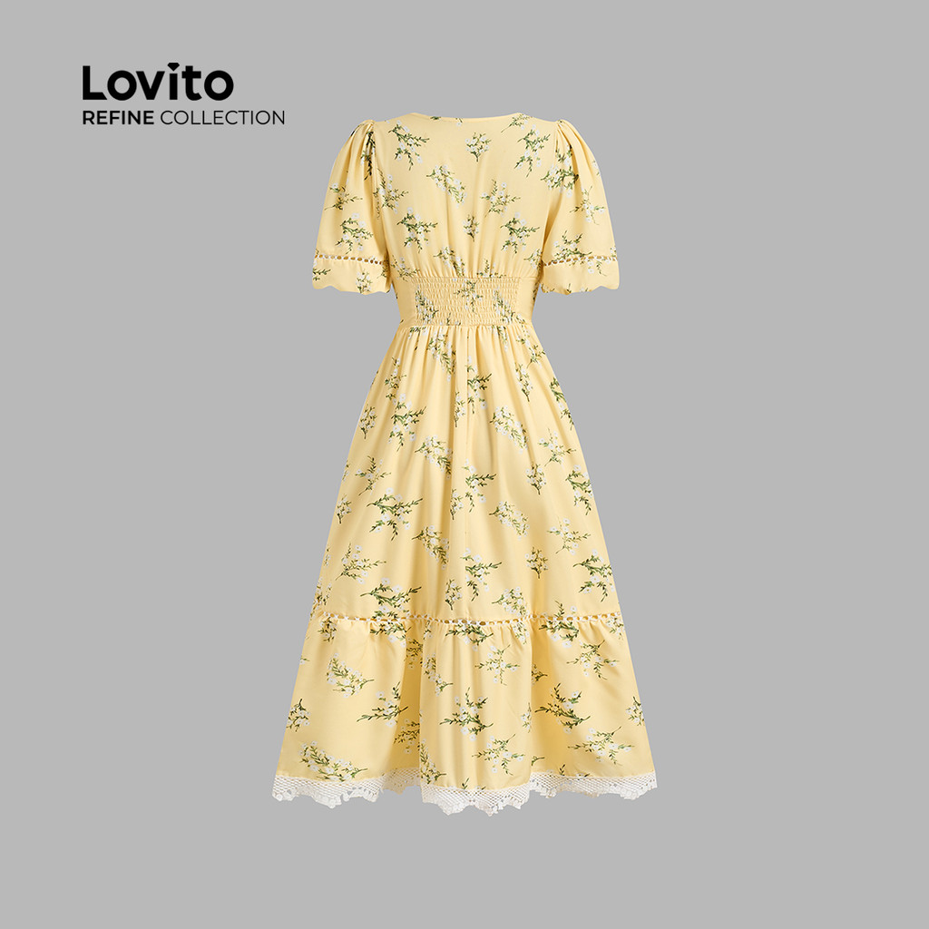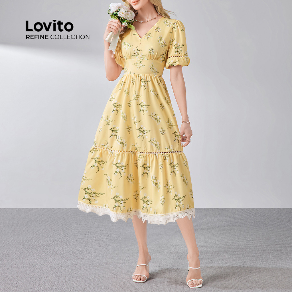 (NEW) (Lovito Refine) Vestido com Zíper Golas Franzidas Dupla Camada Primavera/verão Vestido amarelo LR13L170