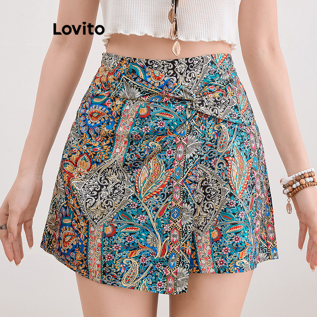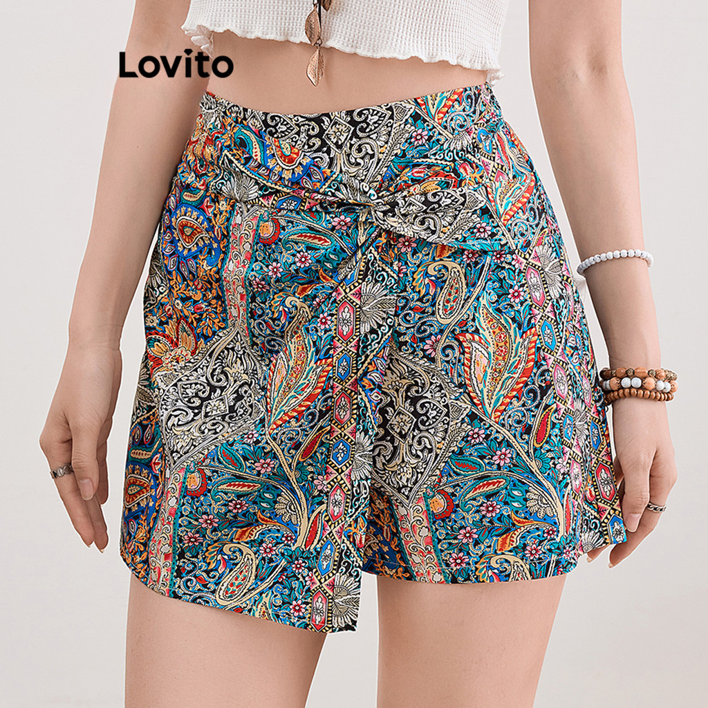 Lovito Shorts Boho com Amarração e Estampa Geométrica para Mulheres Verão L109MD235