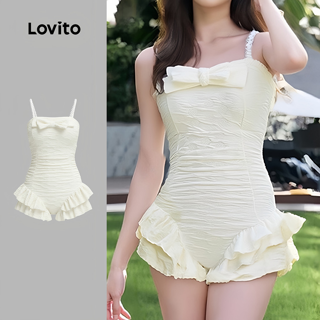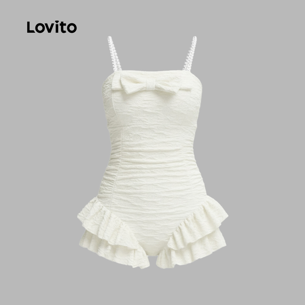 Lovito Maiô de Uma Peça Fofo com Padrão Plissado e Laço para Primavera/verão em Damasco para mulheres. LNE134051