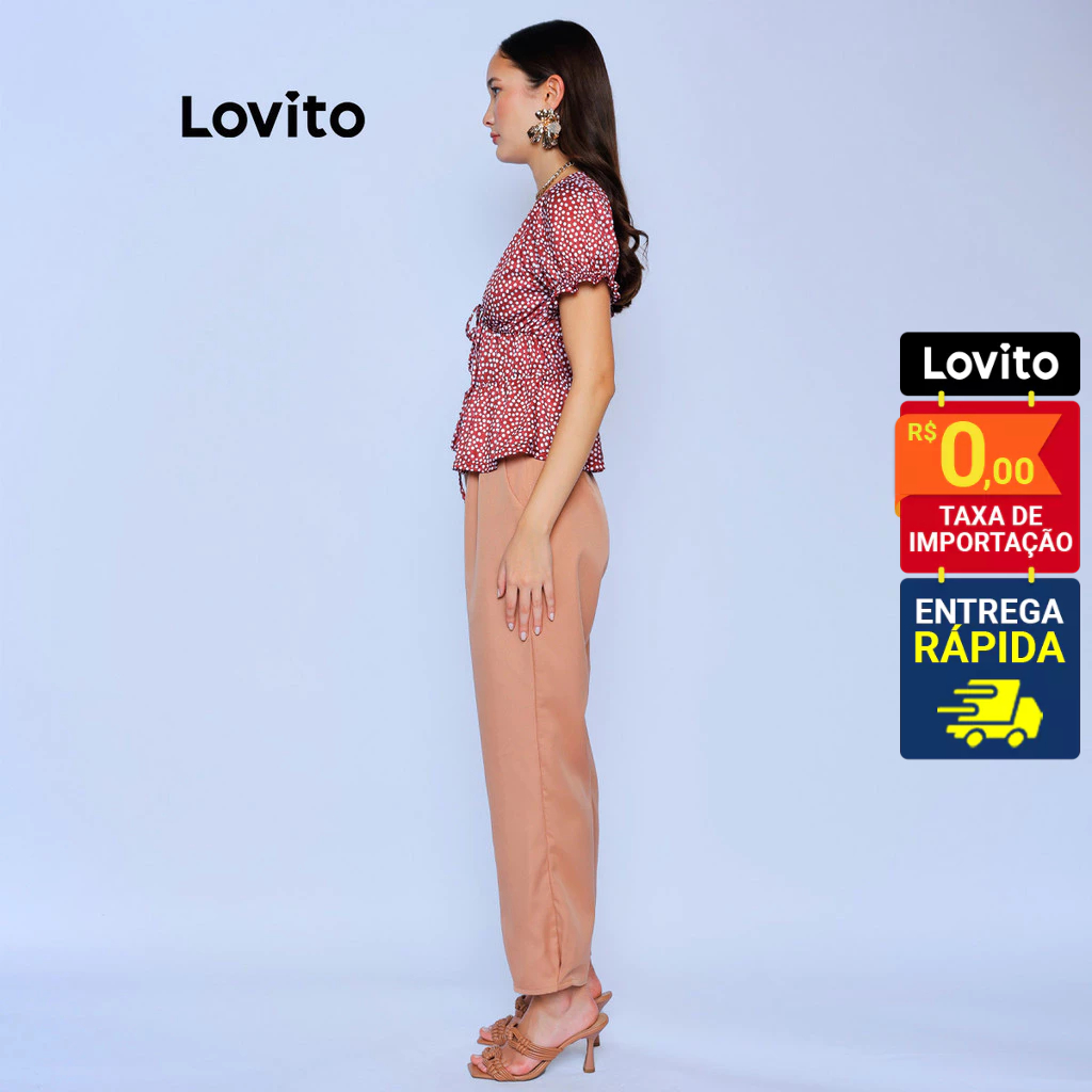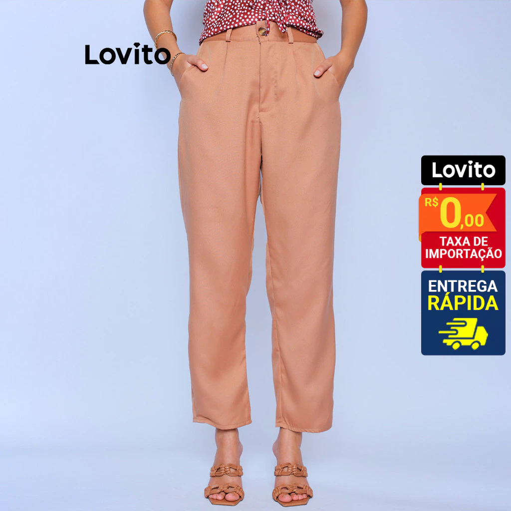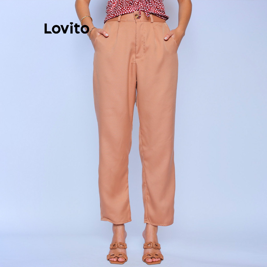 Lovito Calça Alfaiataria Bolsos e Botoes Bege Cenoura Lisa Elegante Feminina LB914BRL944