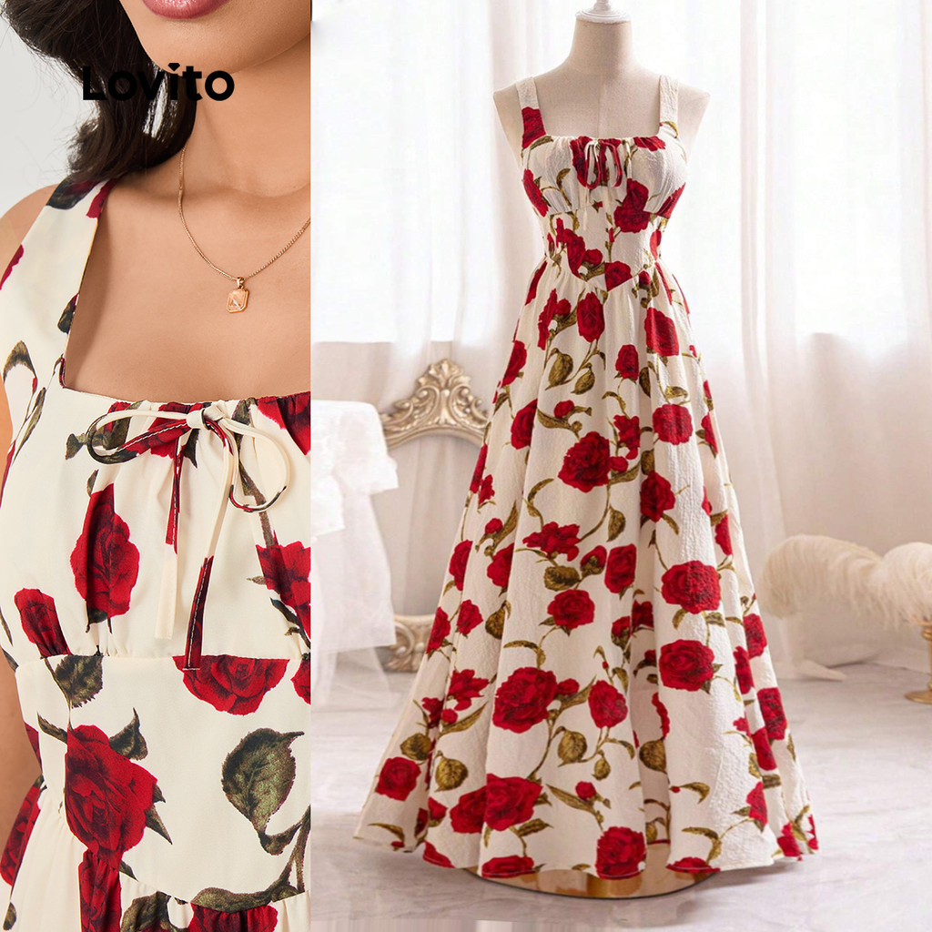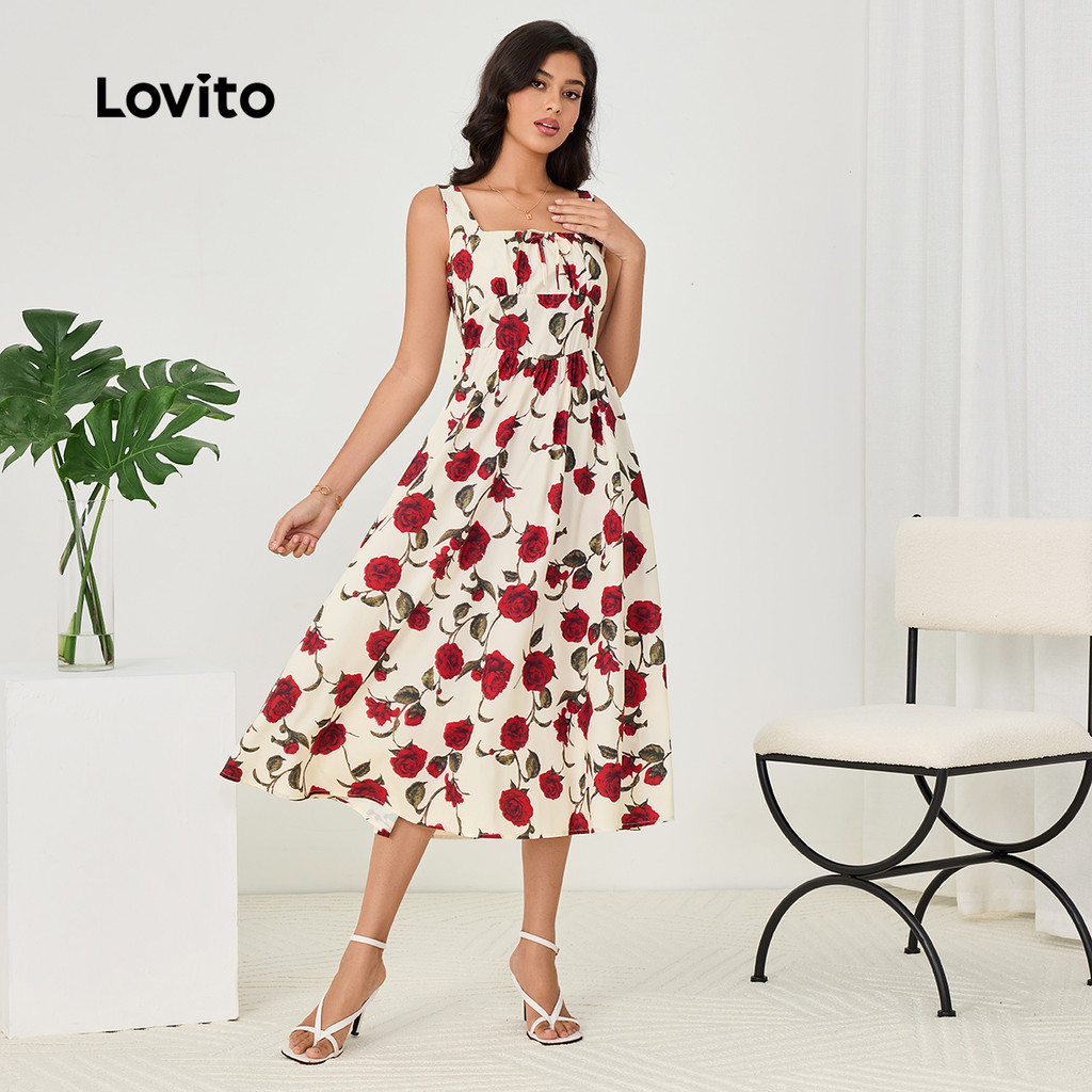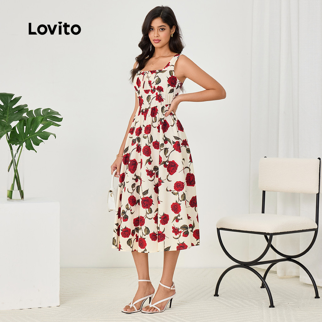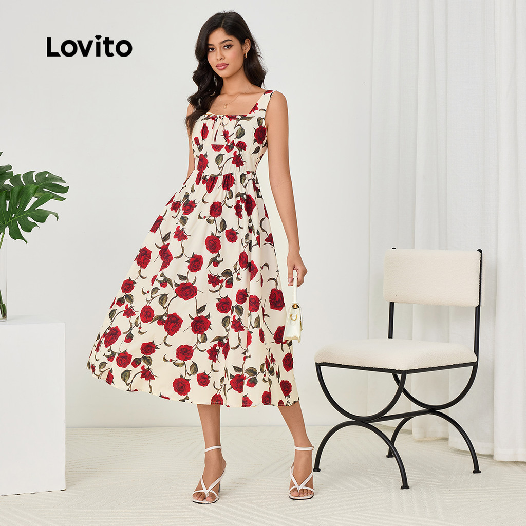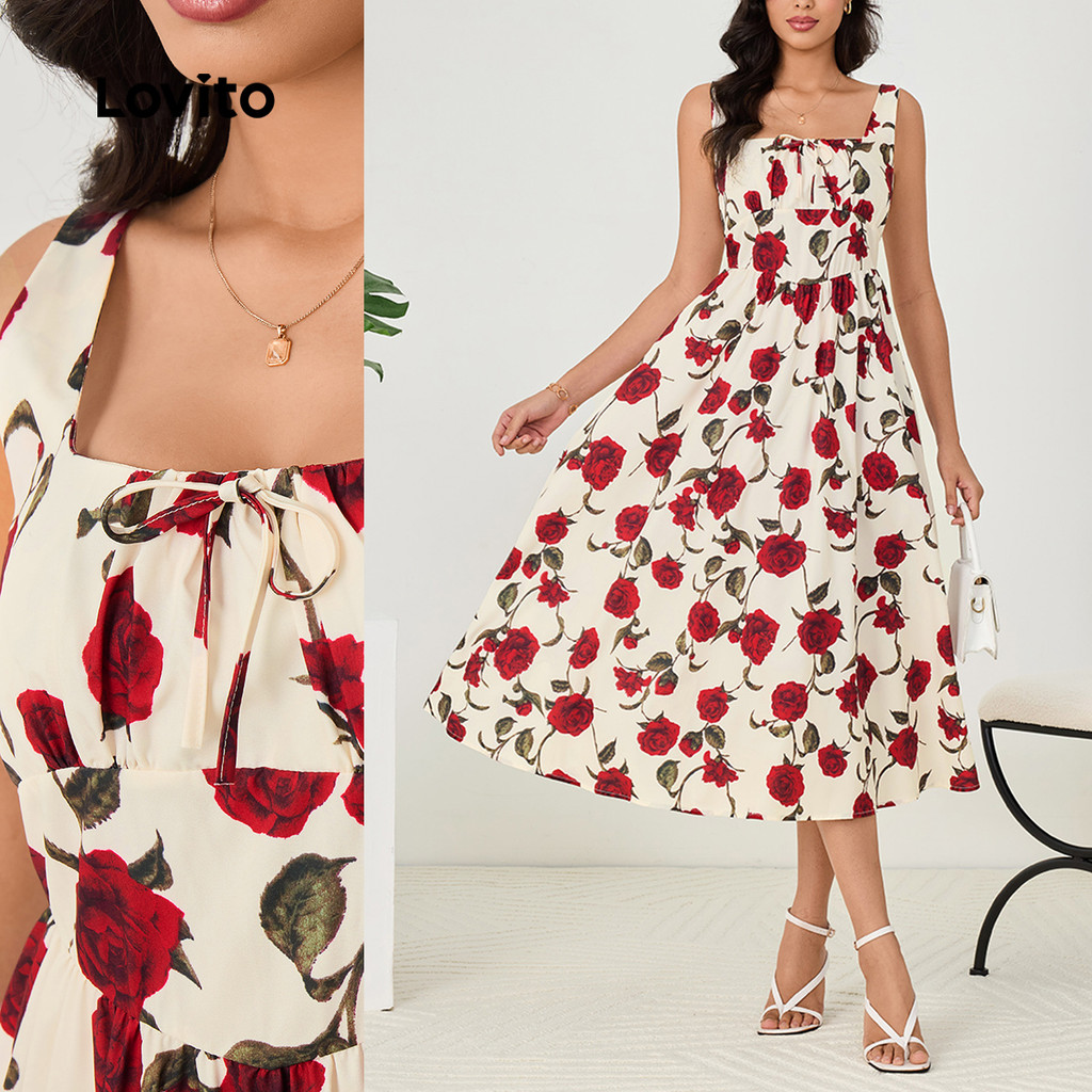 (Trendy) Lovito Vestido Casual com costura em tecido Floral e nó plissado para mulheres LBL23194