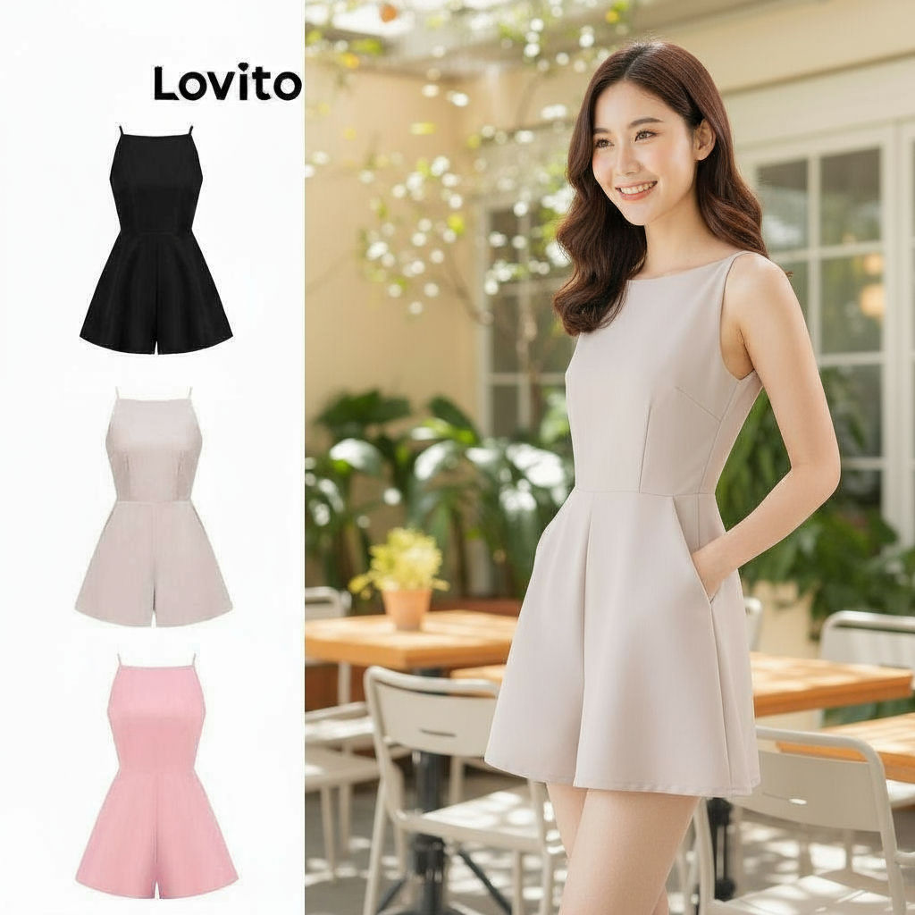 (Trendy2) Lovito Macacão Casual Liso Plissado Para Mulheres L80ED343 (Multicolorido)