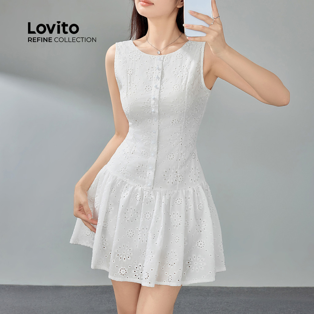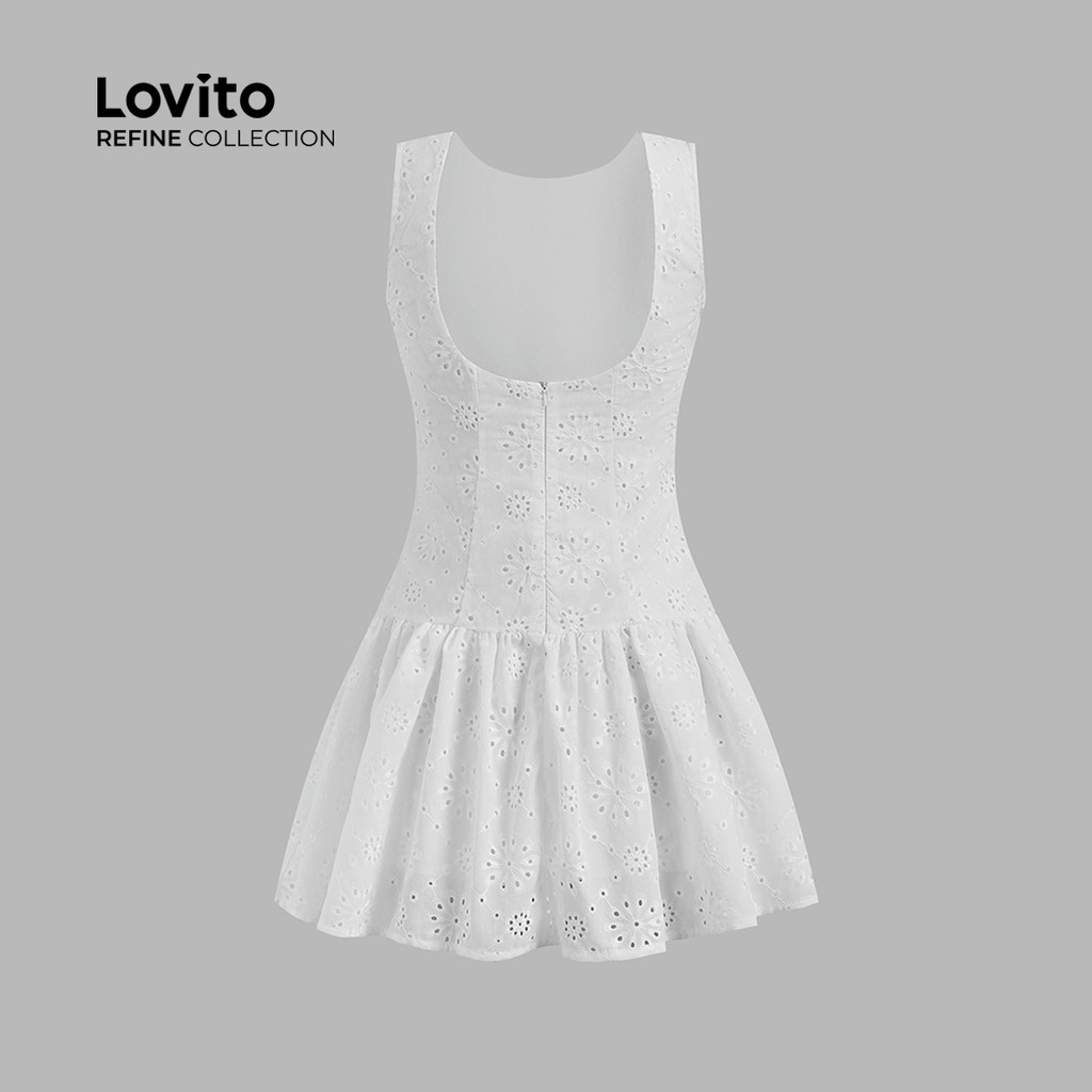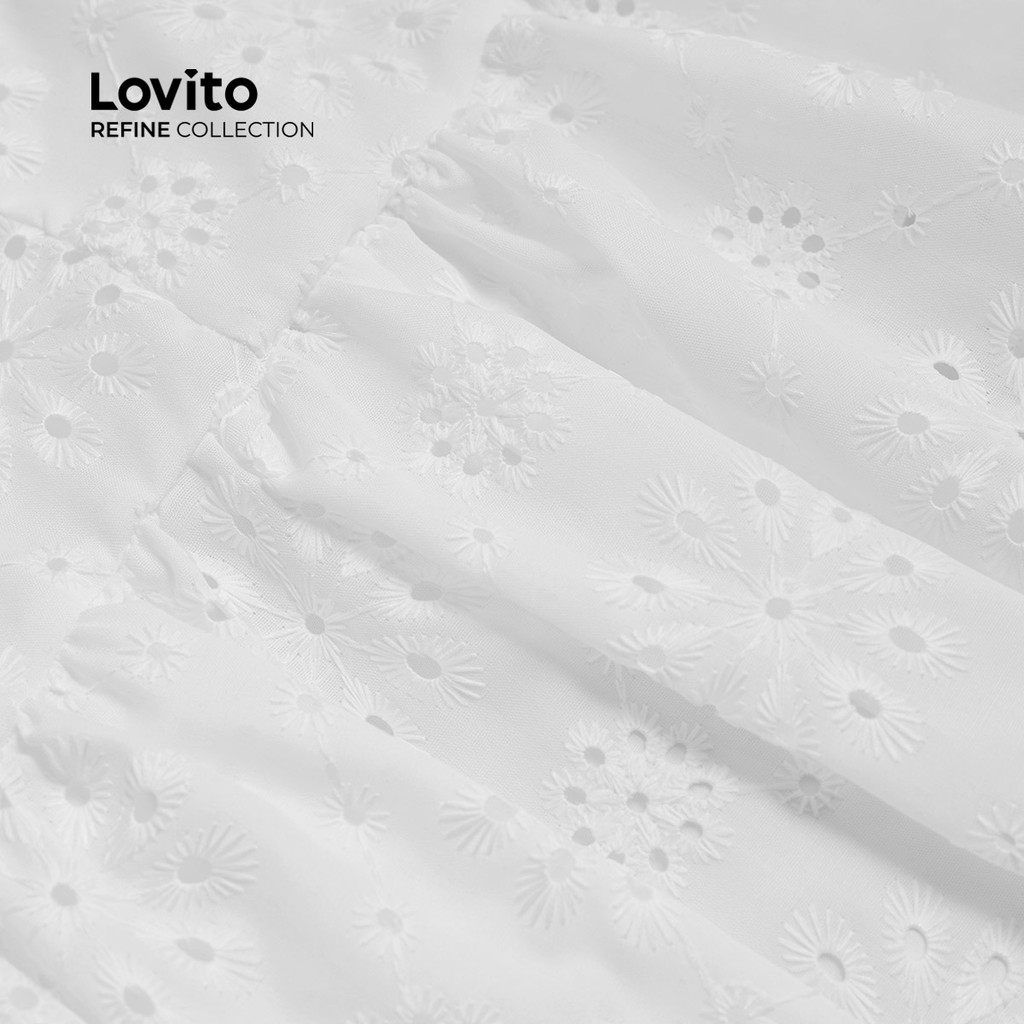 (Lovito Refine) Vestido Feminino Casual com Bordado e Ilhós Lisos LR2ED078