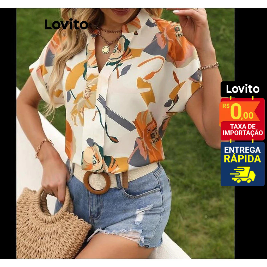 Lovito Blusa Manga Curta Decote V com Vista sem Botões Estampa Floral Feminina LNL42015
