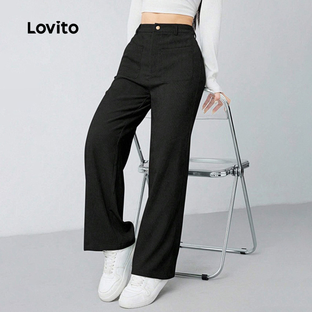 Lovito Calças Casuais com Bolsos Primavera/verão Pretas para Mulheres L158AD143