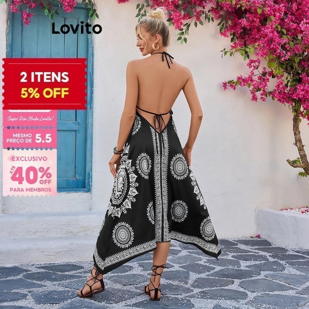 (KOL‘s pick) Lovito Vestido Boho Com Estampa Tribal E Amarração Nas Costas Sem Costas Para Mulheres LBL18742