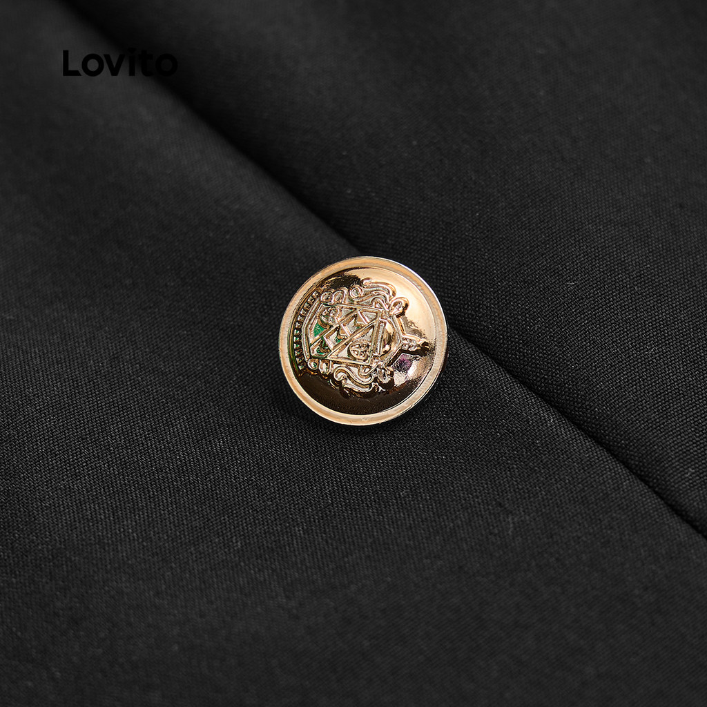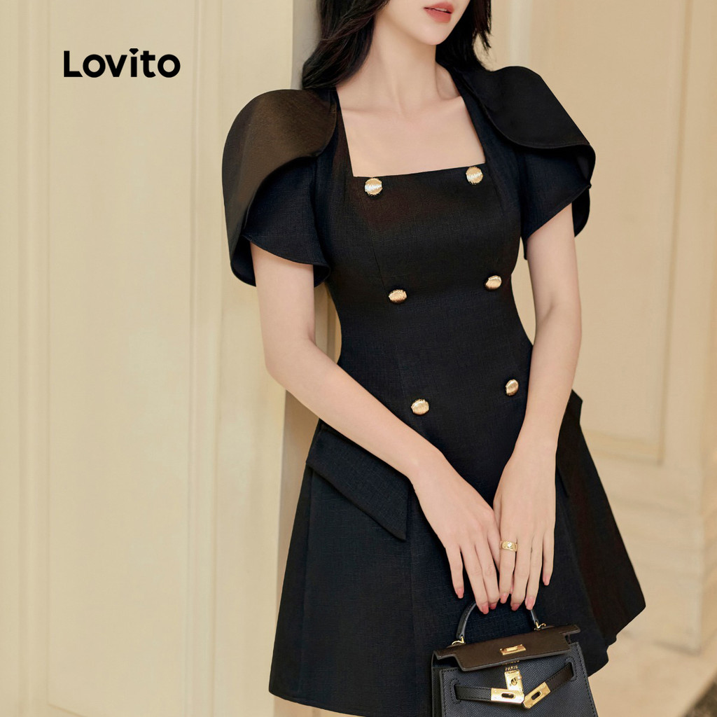 Lovito Vestido Elegante com Babados e Botões Duplos, Preto, Primavera/Verão, Mulheres L134ED199