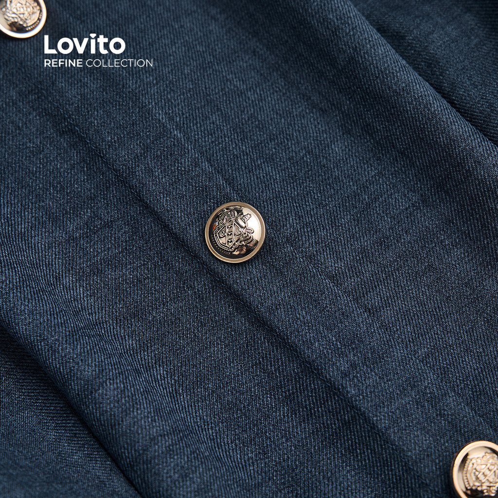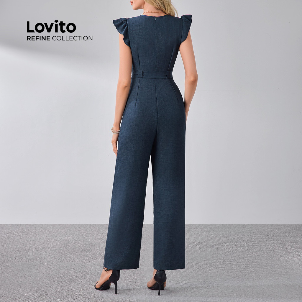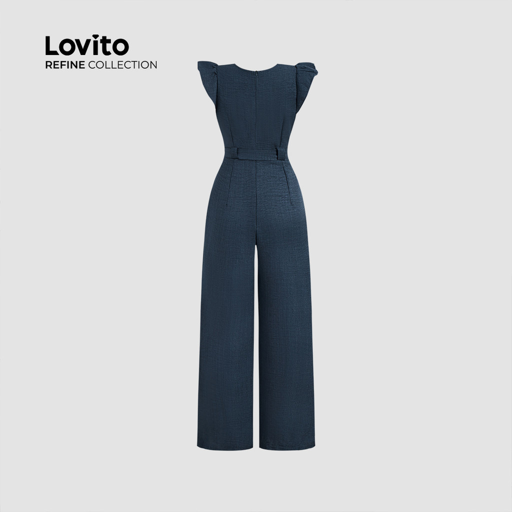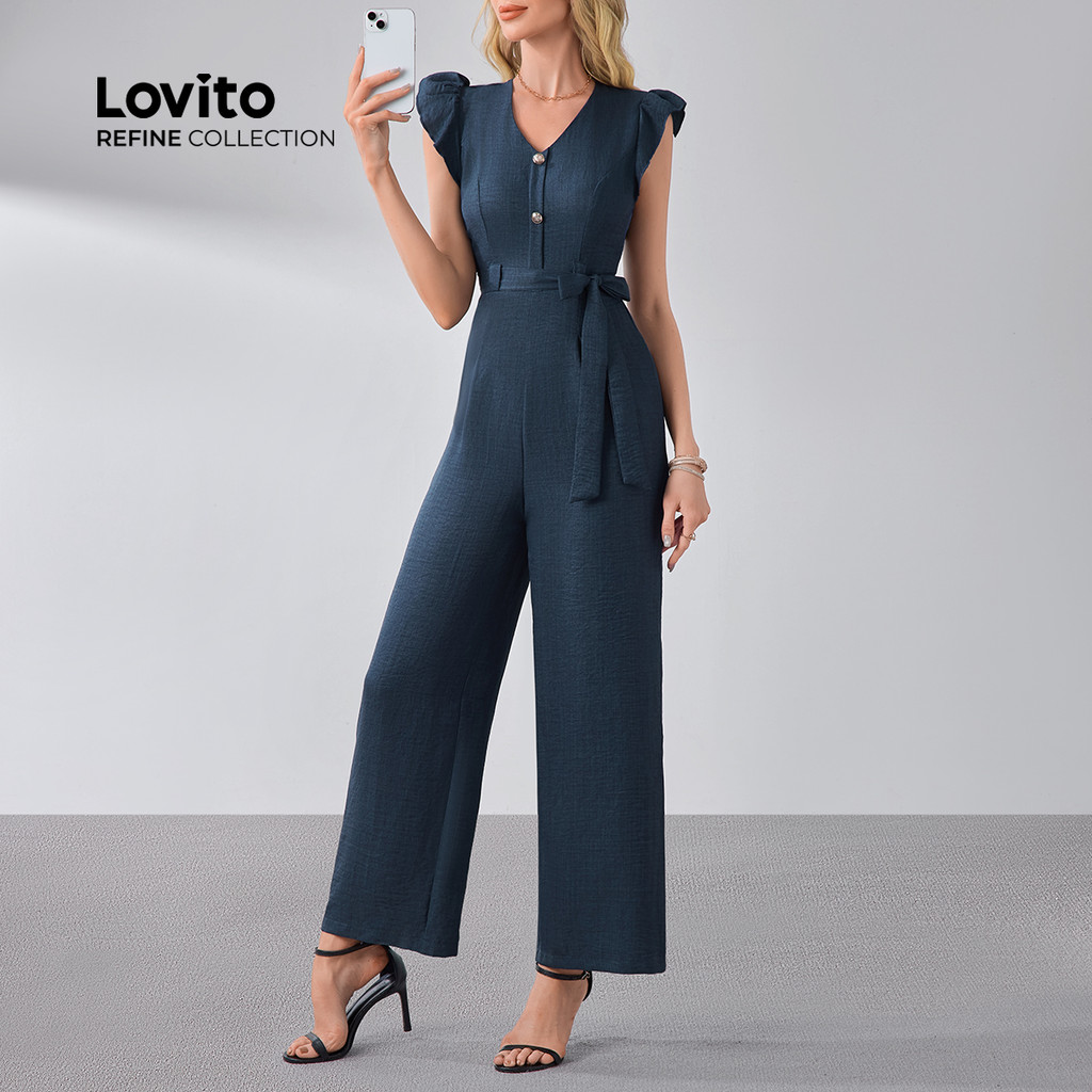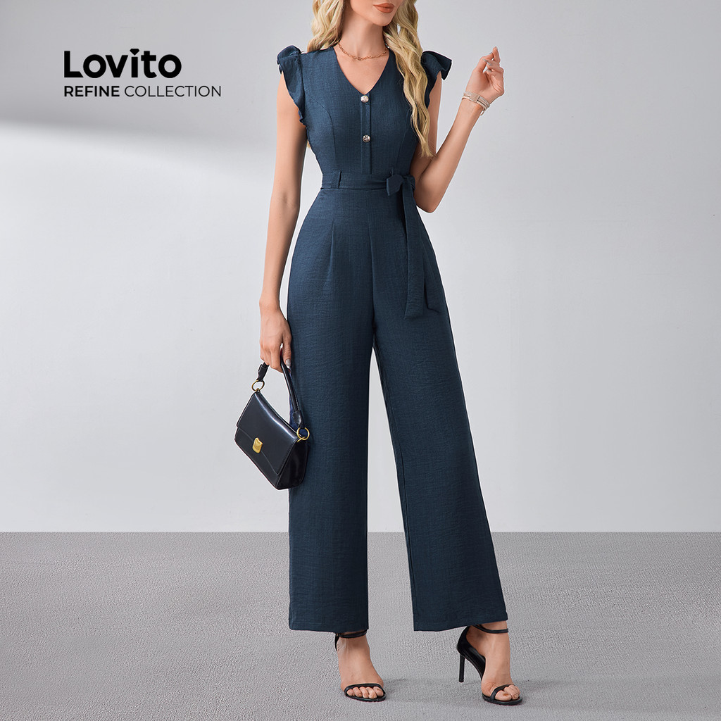 (NEW) (Lovito Refine) Macacão Elegante com Botões Cinto para Todas As Estações Azul marinho para Mulheres LR13L066