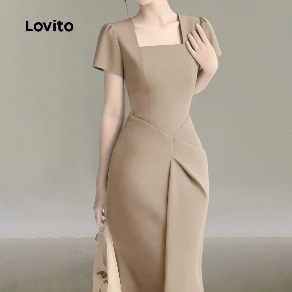 Lovito Vestido Elegante De Verão/primavera Com Pregas Estruturadas Na Cor Cáqui Para Mulheres L155AD2034