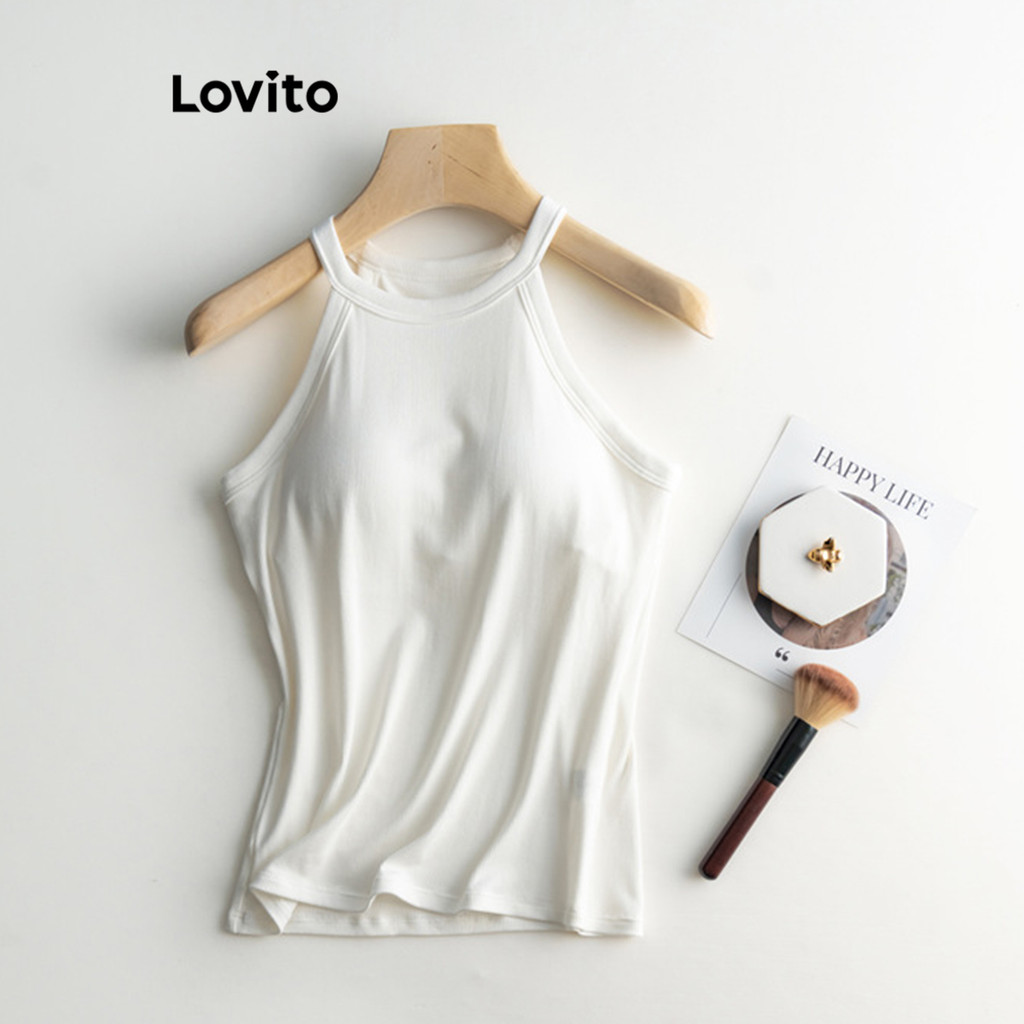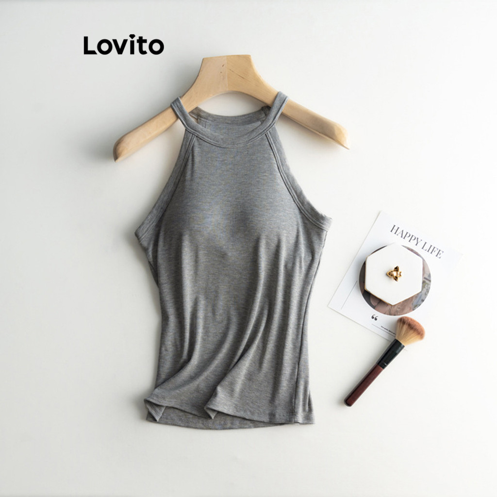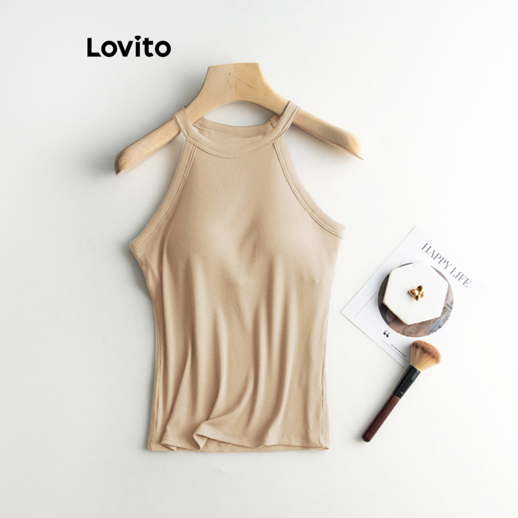 (Trendy) Lovito Casual Regata Feminina Simples com Bojo LNL36137 (Cáqui/Damasco/Cinza/Branco/Preto)