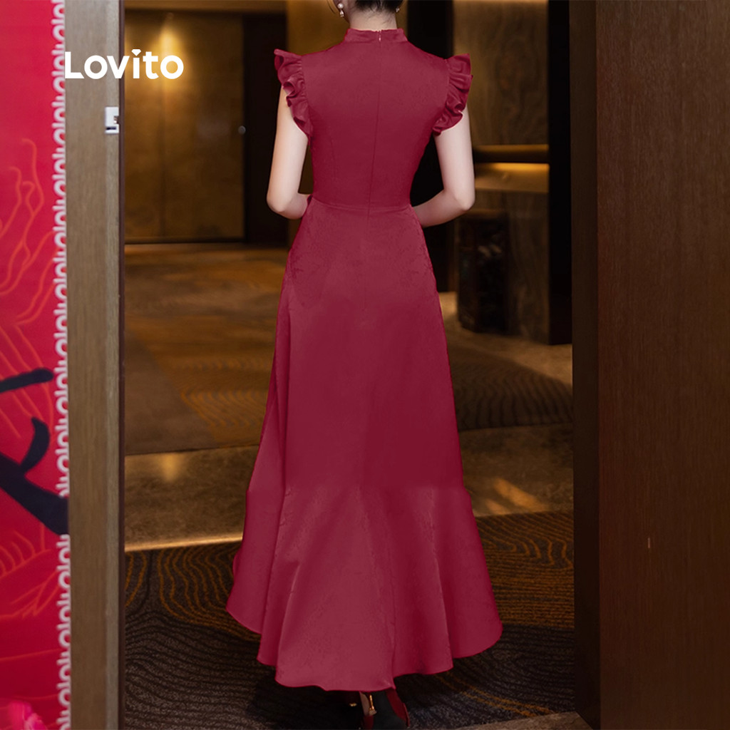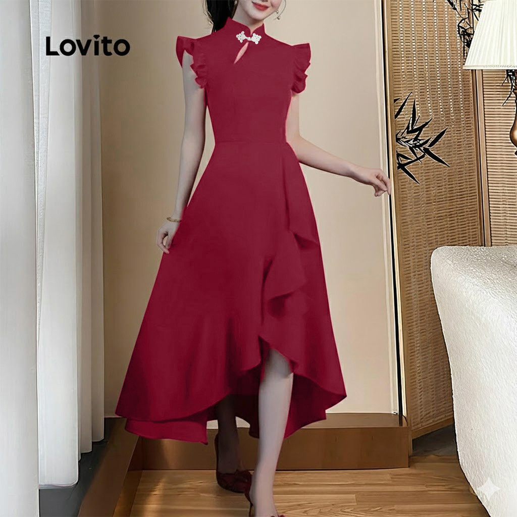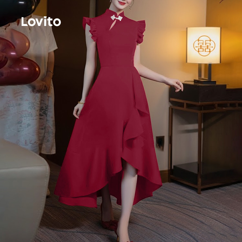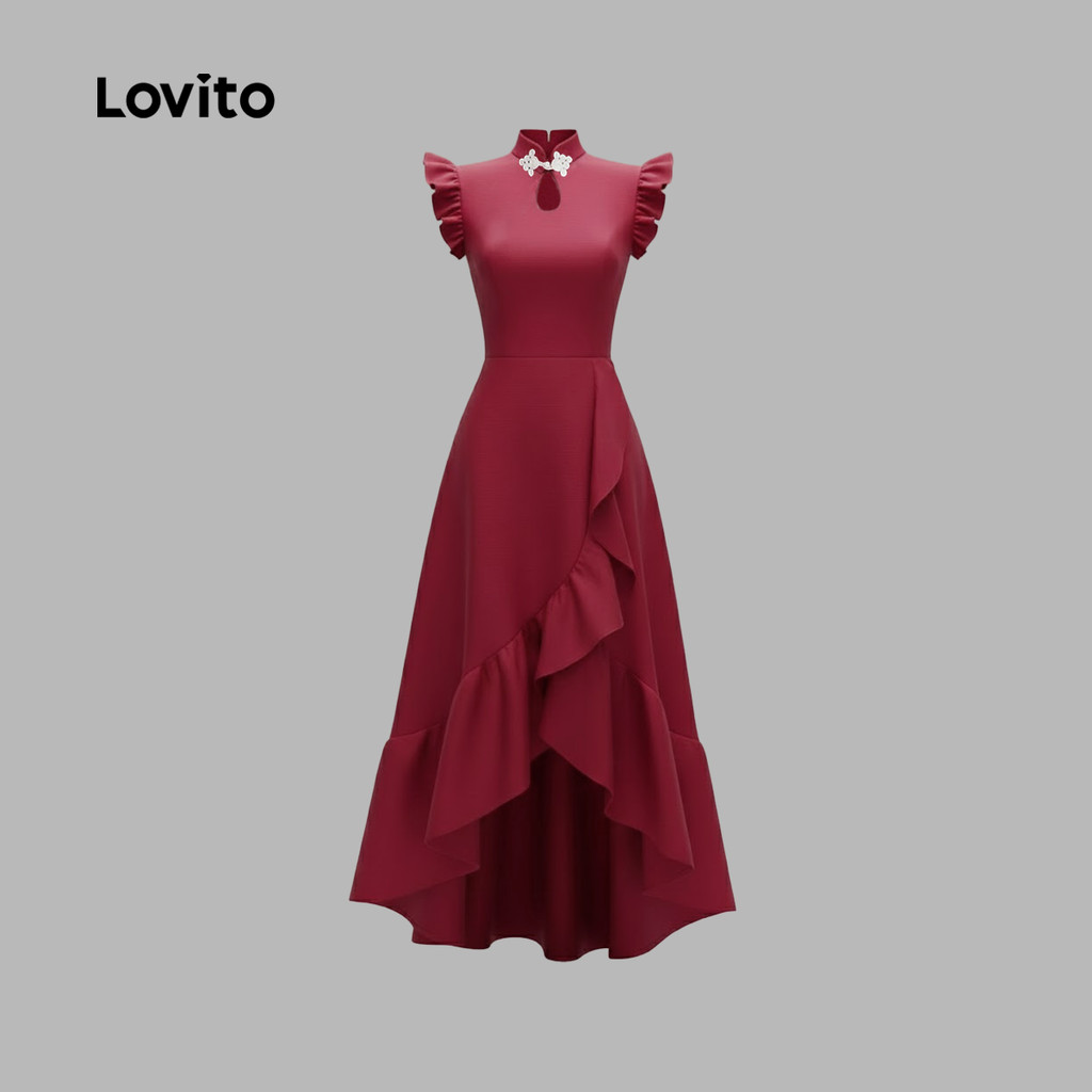 Lovito Vestido Elegante De Festa Com Botões Estilo Chinês Cor Vinho Para Mulheres Ideal Para a Primavera/verão LK2ED453