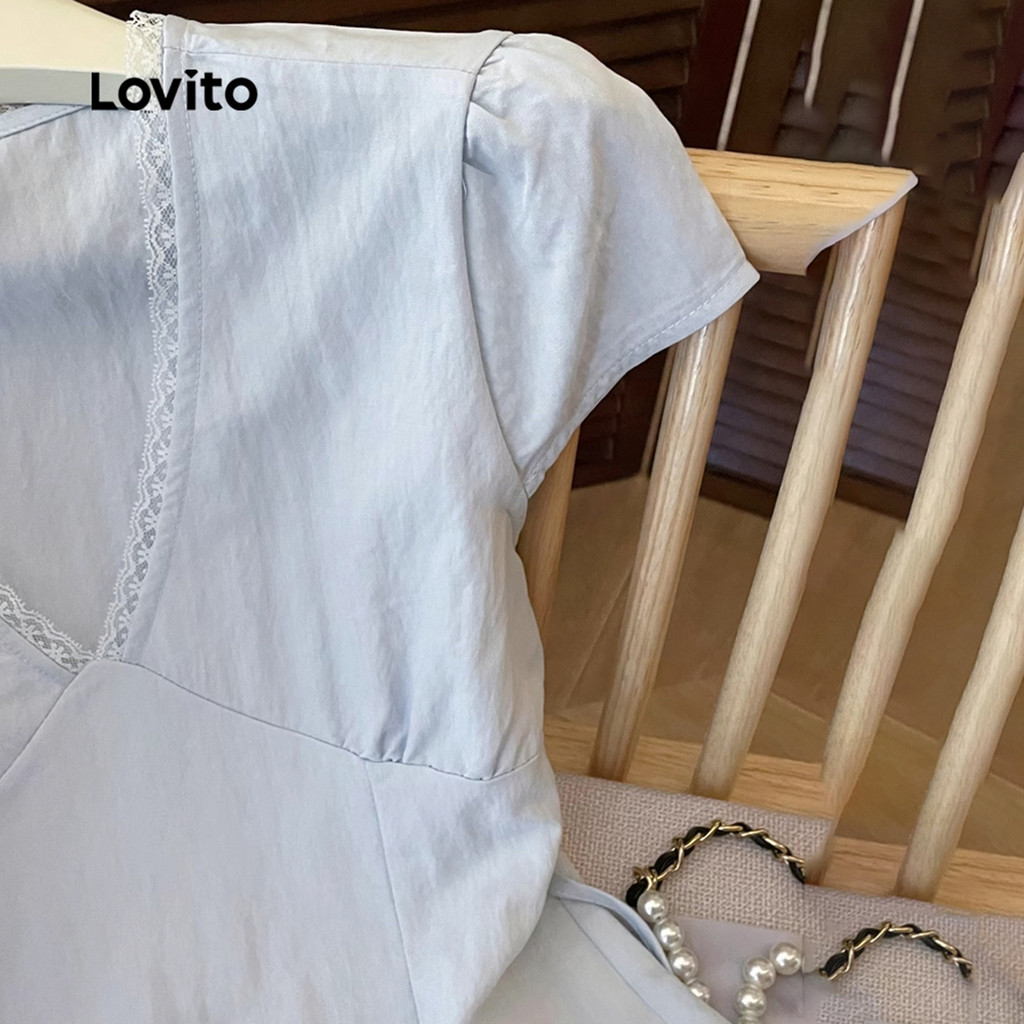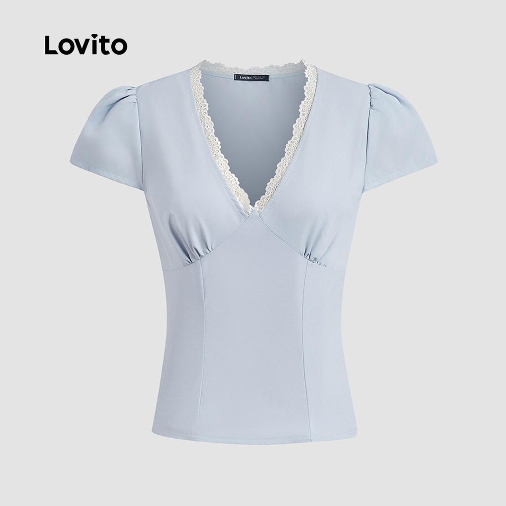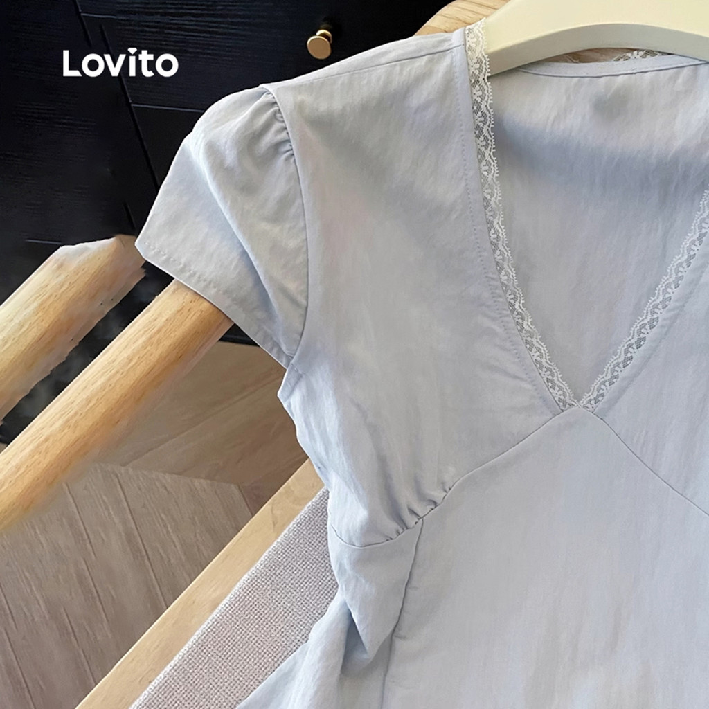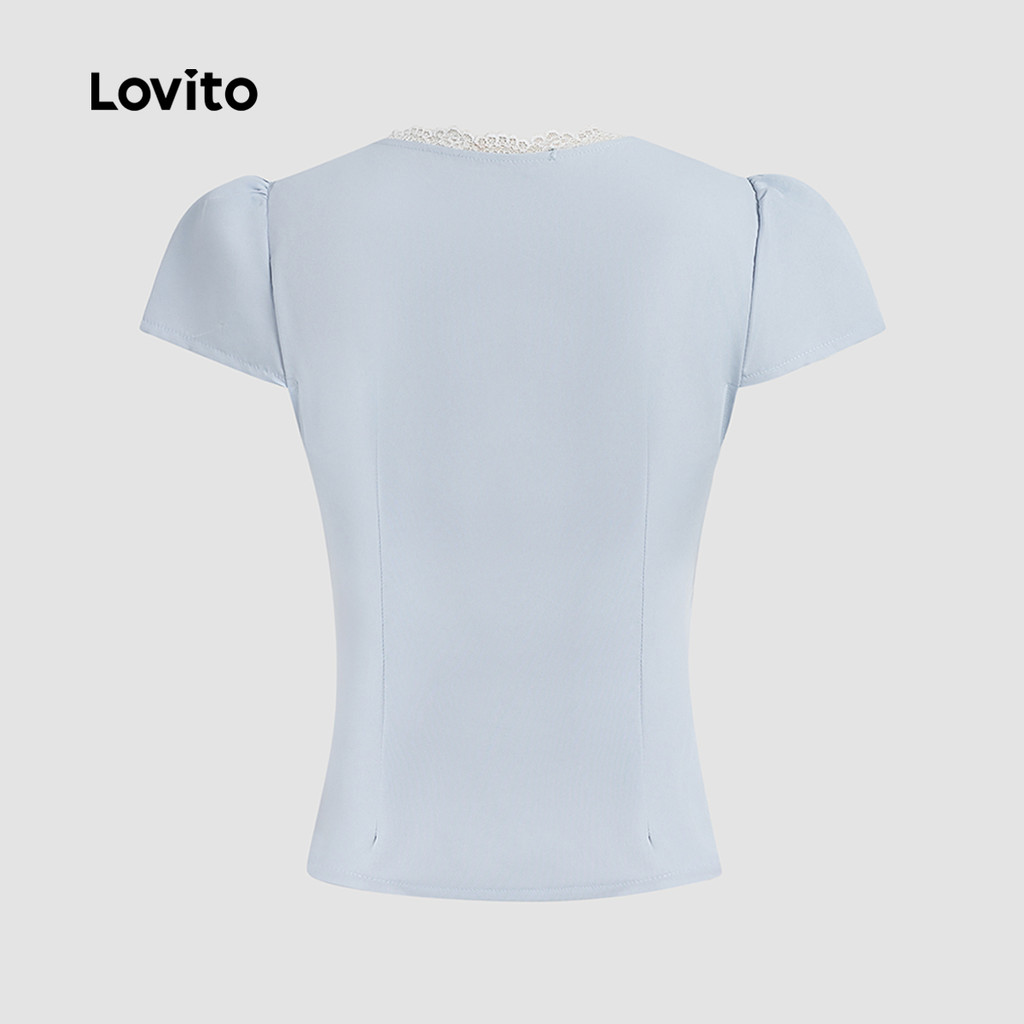 (New) Lovito Blusa Casual de Renda Leve em Cores Block para Primavera/verão Blusa Azul para Mulheres L144AD132